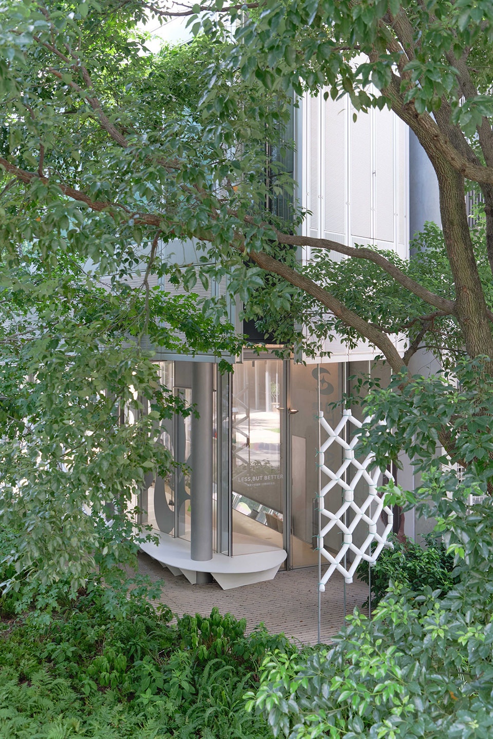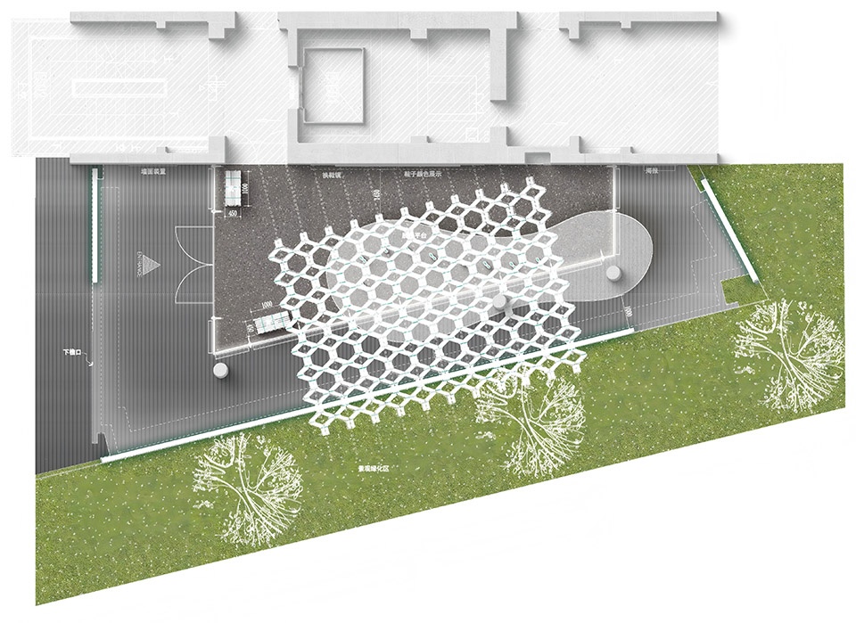 ▼外侧成为可休憩、可打卡的“呼吸空间”,on the exterior it settles beneath dappled green shadows, forming a “breathing space”