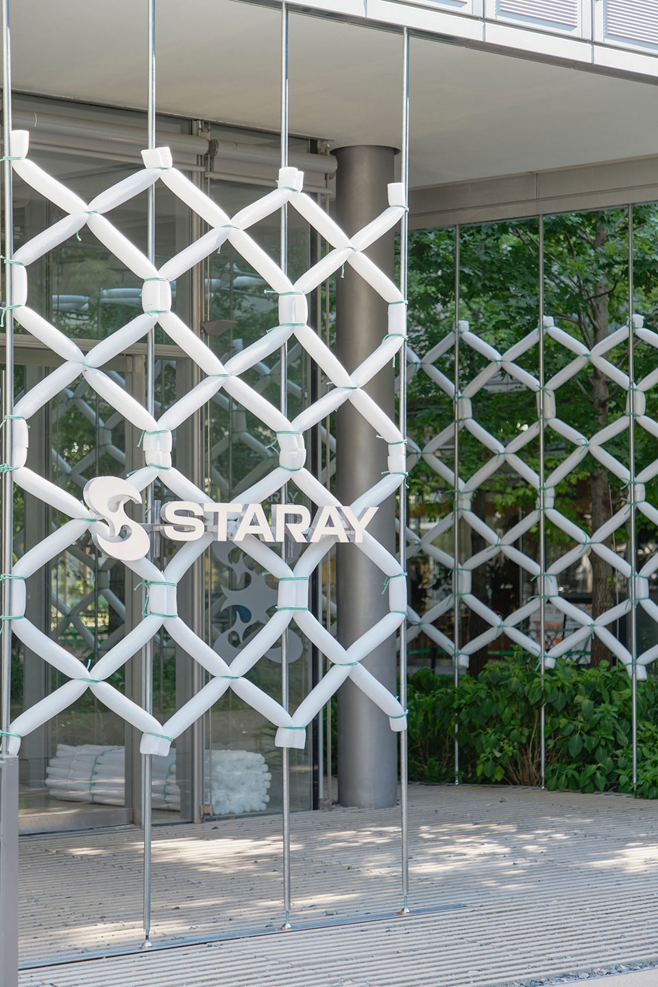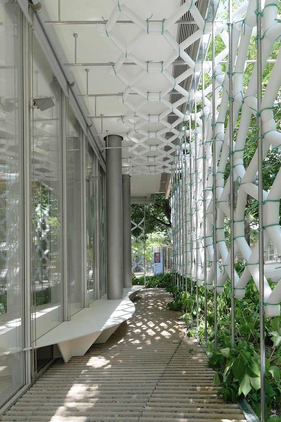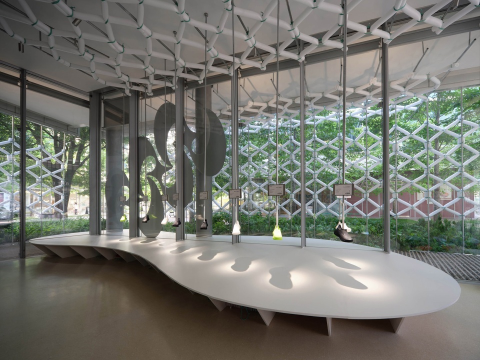 we recorded a rhythm of space—leaving behind a trace within OōEli.The installation pierces through Renzo Piano’s architecture, half inside, half outside.On the interior, it becomes seating for trying on shoes; on the exterior, when sunlight and mist pass through, it settles beneath dappled green shadows, forming a “breathing space” where one can pause, rest, and capture a moment.