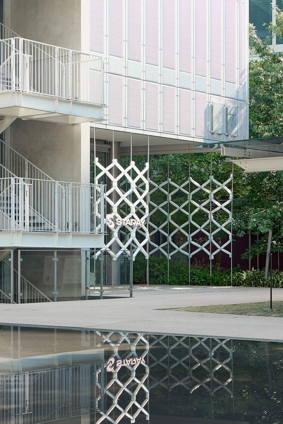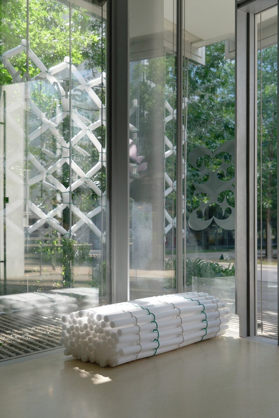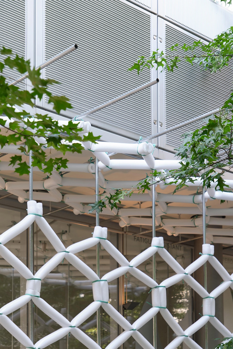 we recorded a rhythm of space—leaving behind a trace within OōEli.The installation pierces through Renzo Piano’s architecture, half inside, half outside.On the interior, it becomes seating for trying on shoes; on the exterior, when sunlight and mist pass through, it settles beneath dappled green shadows, forming a “breathing space” where one can pause, rest, and capture a moment.