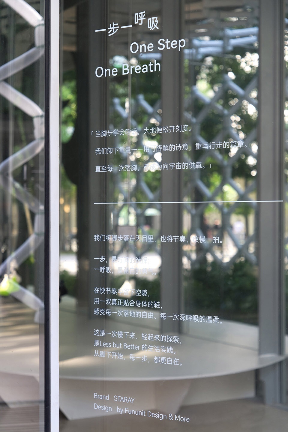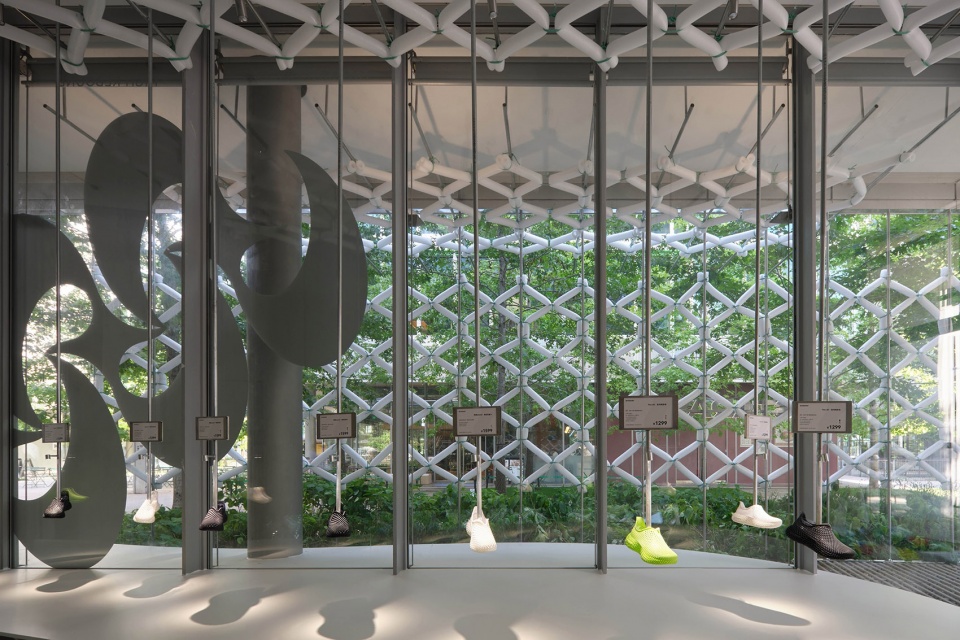 我们记录一段空间节奏,在天目里留下一段足迹。穿透了皮亚诺的建筑,一半在内部、一半在外侧。内侧成为试鞋的座席;外侧是当阳光与水雾穿过后,落在斑驳绿影下,成为可休憩、可打卡的“呼吸空间”。