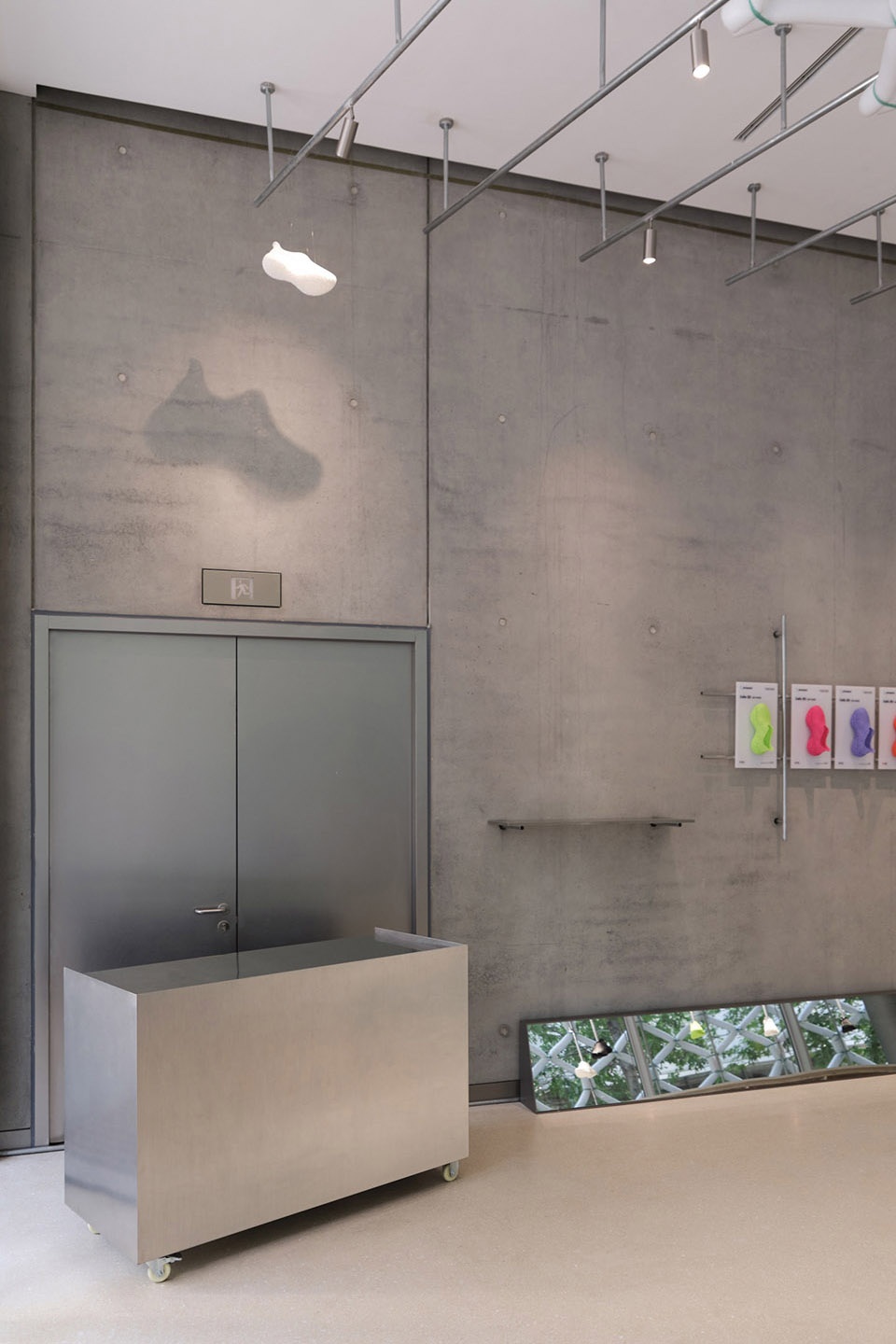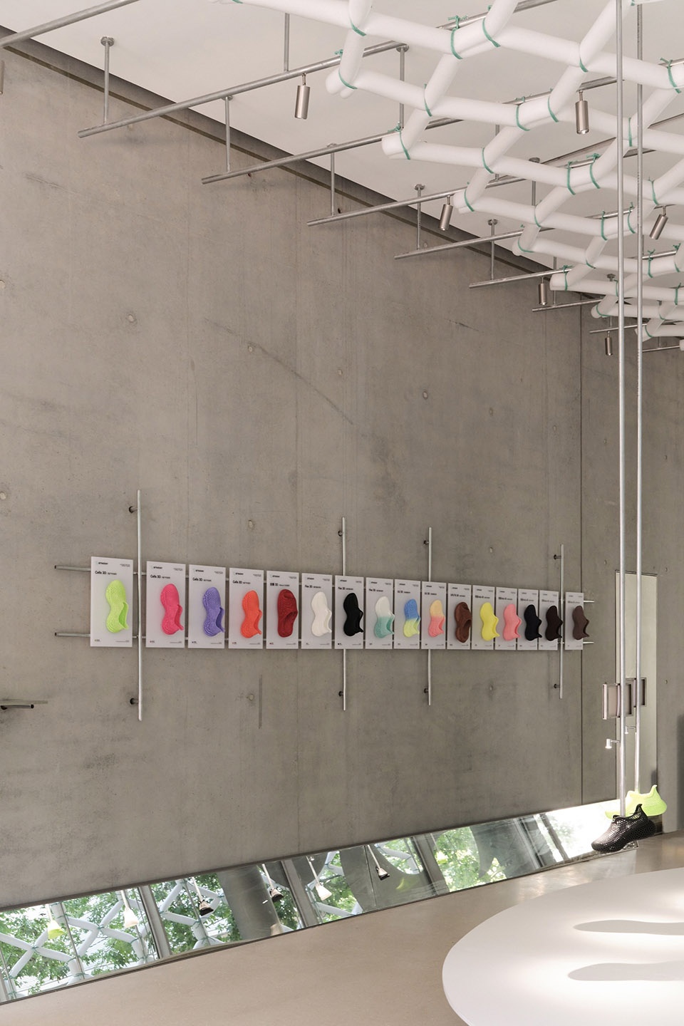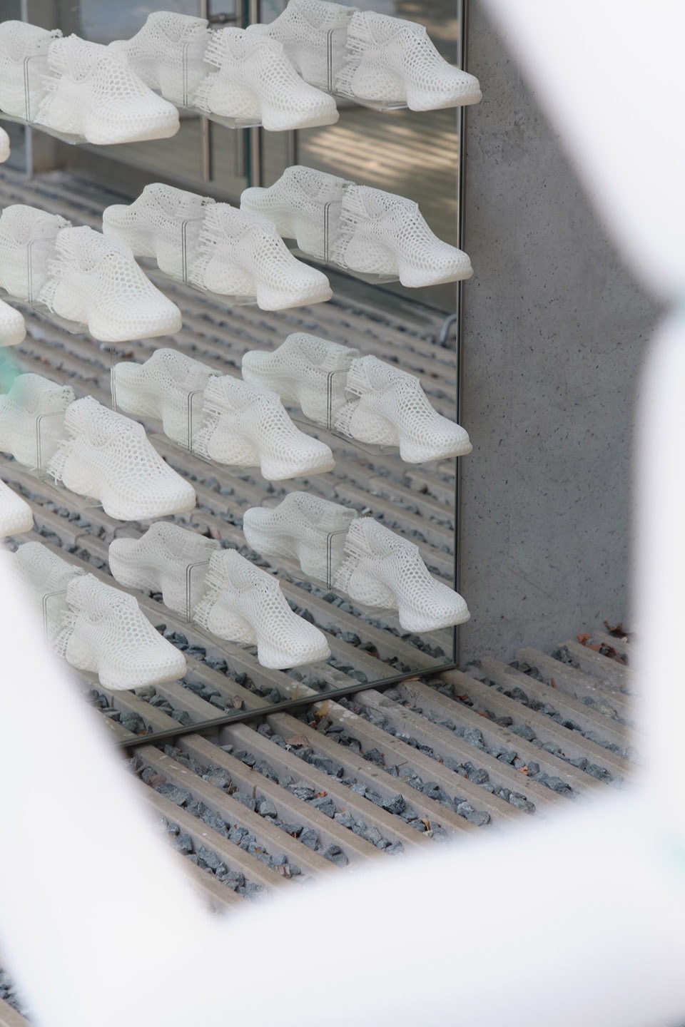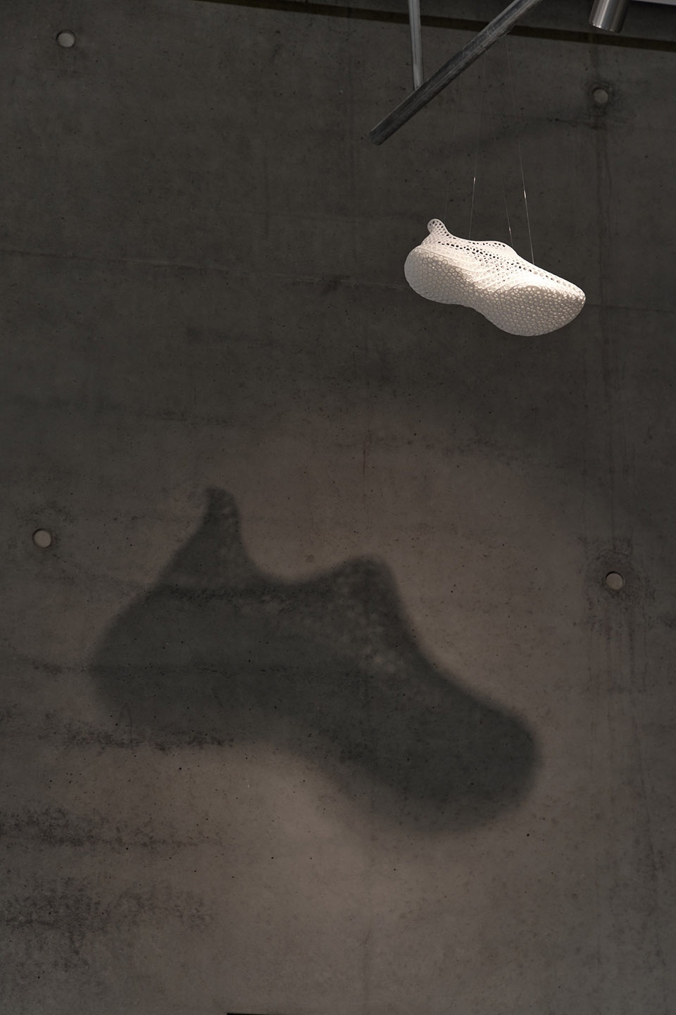 Shoes “floating” above the entrance, their crystalline structures projected onto OōEli’s fair-faced concrete walls through light.Shoes suspended against the perforations of OōEli’s concrete walls, transformed into a color display without damaging the surface.Shoes of 3D STARAY penetrating through mirrors, appearing suspended in reflection.Displayed shoes elevated and “floating” above the exhibition stands, creating a sense of levitation.