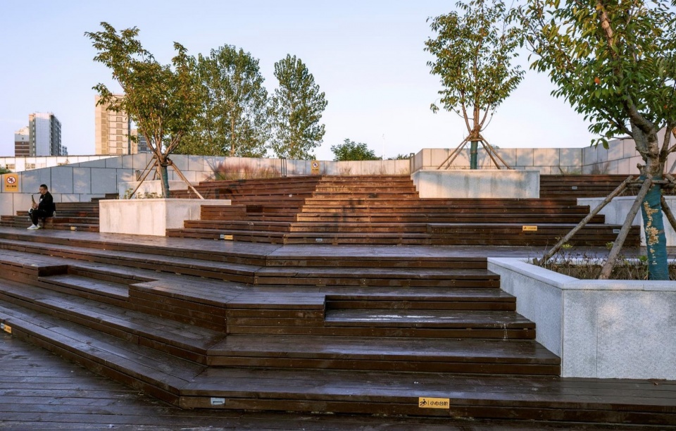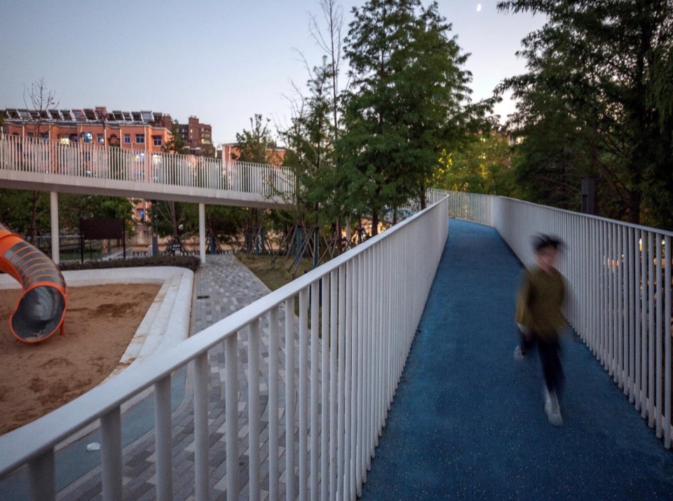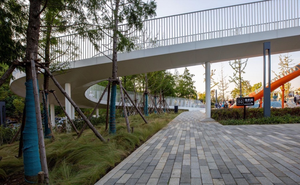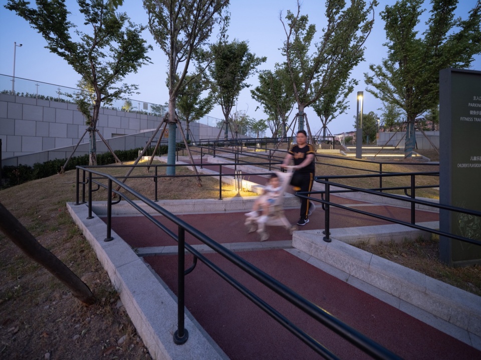 在进行城市公园景观塑造的基础上,为周边的老人、孩童等居民提供跑道、爬梯、步道、休憩台阶、无障碍设施等多样的日常娱乐设施,也为城市提供公共卫生间等城市基础设施,塑造具有日常活力的城市景观。