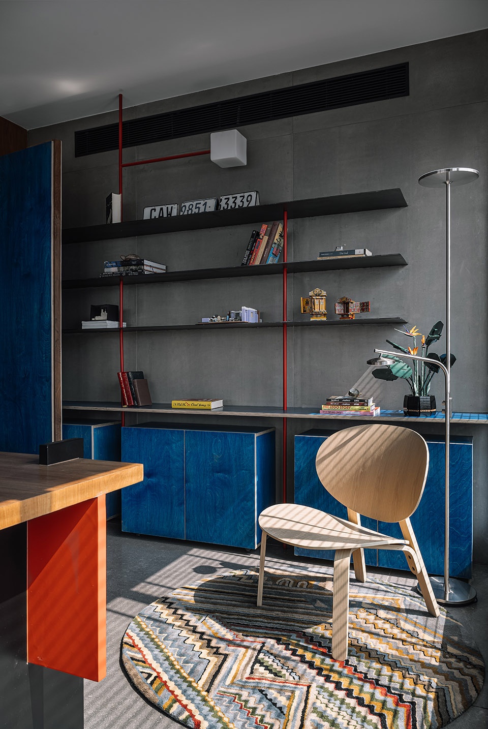 ▼点缀的红、蓝主色为空间注入微妙的能量,