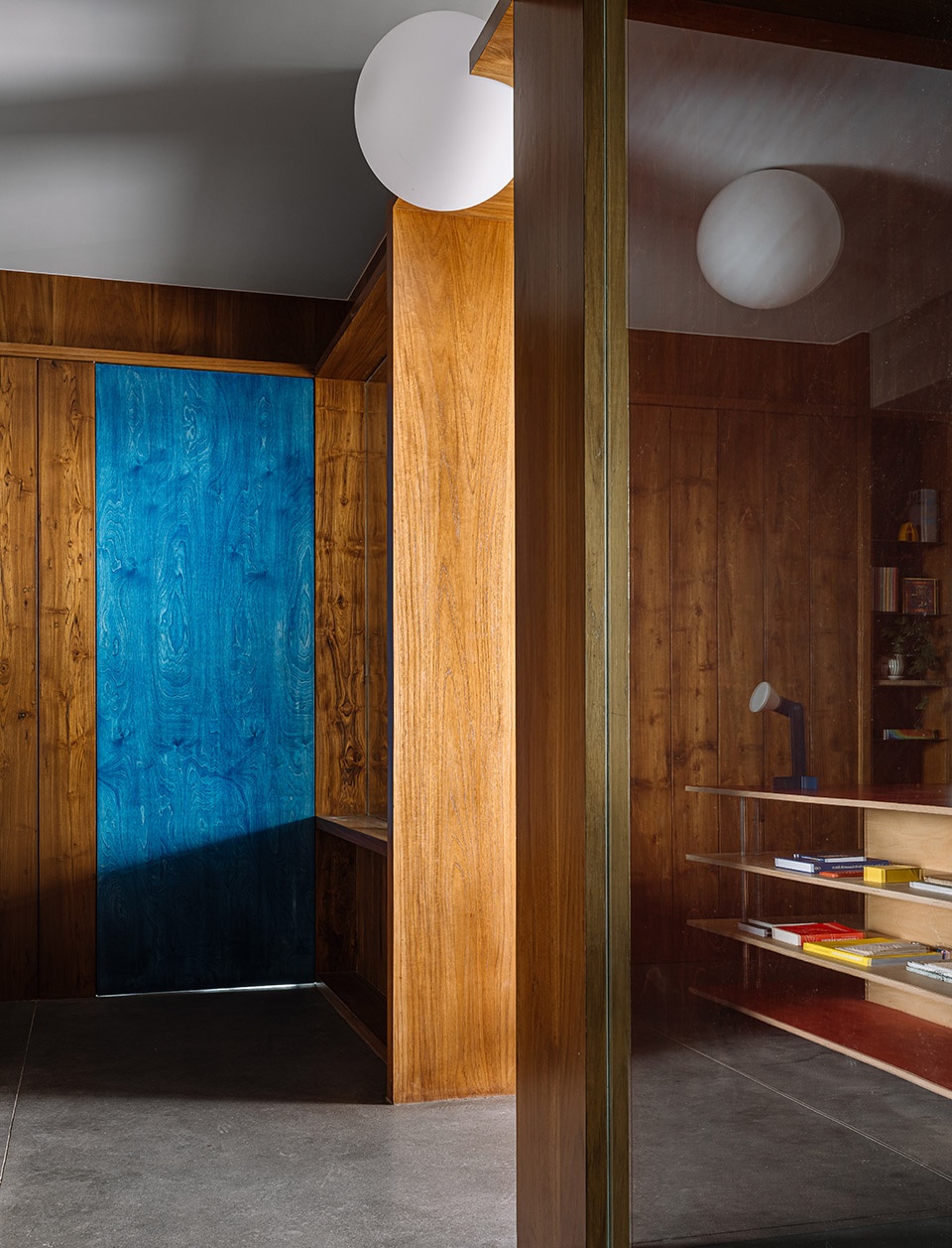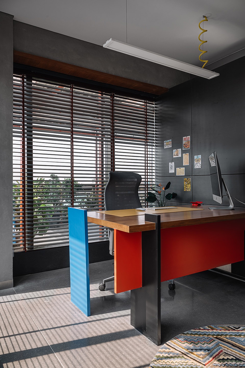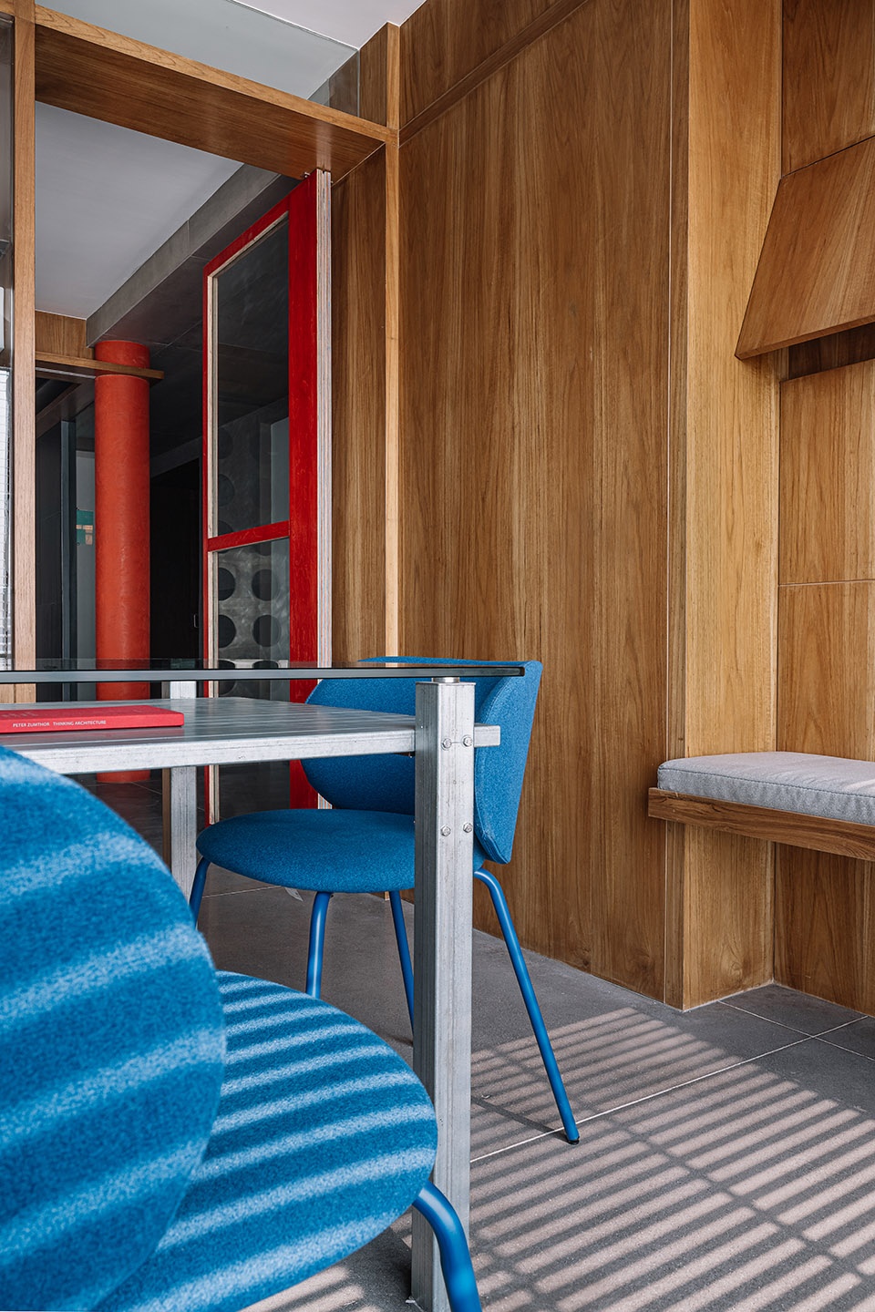 Moving beyond the workspaces, the principal architects’ cabins emerge – spaces designed for focus. Here, simplicity reigns. Straightforward horizontal planes create adaptable work tables and storage units that are as functional as they are minimal. These tables are designed to be reconfigured or removed and repurposed into new tables in the future. The MS pin-up walls make a return, offering both visual cohesion and practical utility. Large windows, facing the terrace beyond, allow natural light to spill in, crafting a serene atmosphere. The cabins are kept intentionally free of texture and decoration, prioritizing clarity and functionality. Here, as in the rest of the studio, subtle variations in texture and material introduce a touch of playfulness. Birch ply appears in different finishes – some stained red or blue, while other areas feature its natural shade, adding depth and interest without disrupting the focus-driven environment.