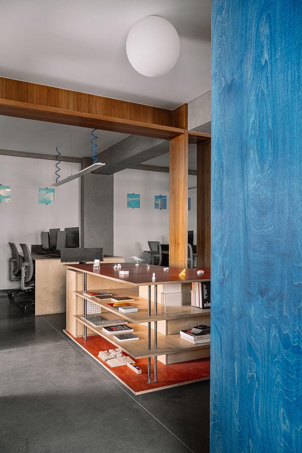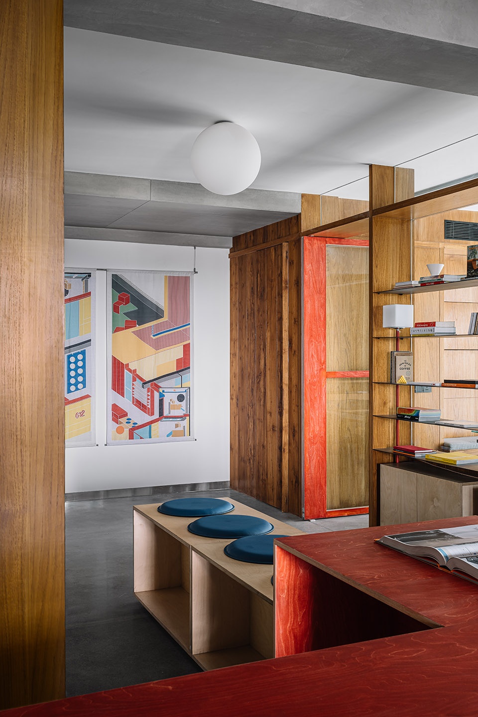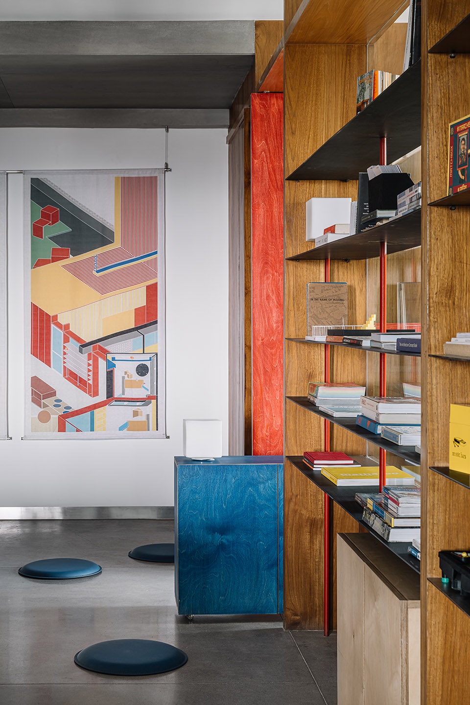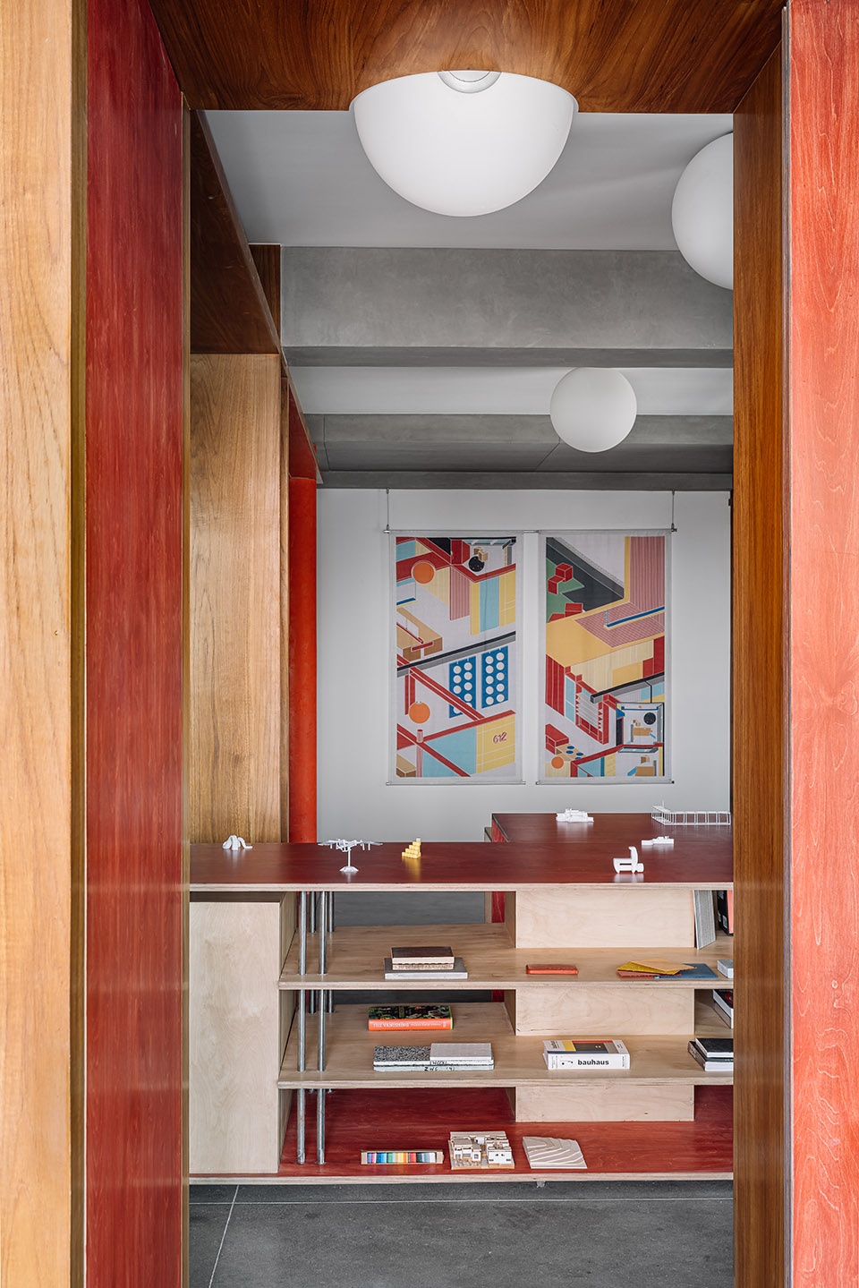 Once inside the central space, a calm, grey-toned palette emerges, setting the mood with its quiet simplicity. Plastered walls and an aggregate concrete floor set a raw, clean foundation. Accents of primary red and blue colors add subtle pops of energy, creating a contrast that feels both vibrant and purposeful. Wood, birch ply, mild steel and stainless steel define the rest of the studio’s material vocabulary, coming together in honest, utilitarian forms. Central to this space is a large, minimal furniture element crafted from plywood and metal. At first glance, it appears to be a straightforward rectangular volume, but its true beauty lies in its versatility. Quietly commanding the room, it adapts to the needs of the moment: a surface for storage, a place for seating, a table for discussion, and a workstation all in one.