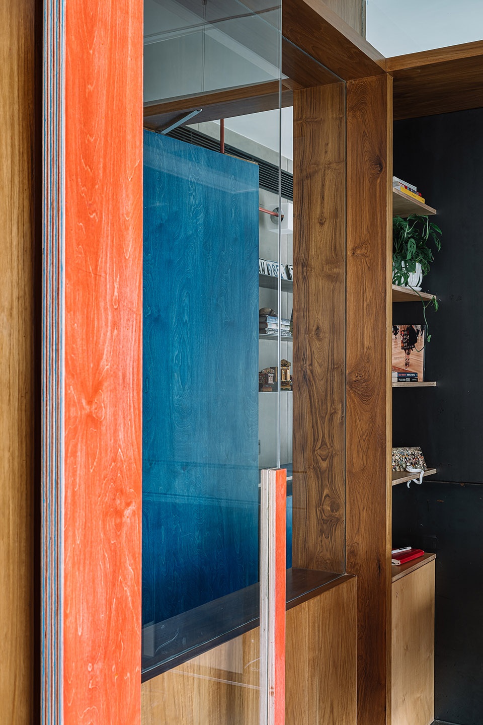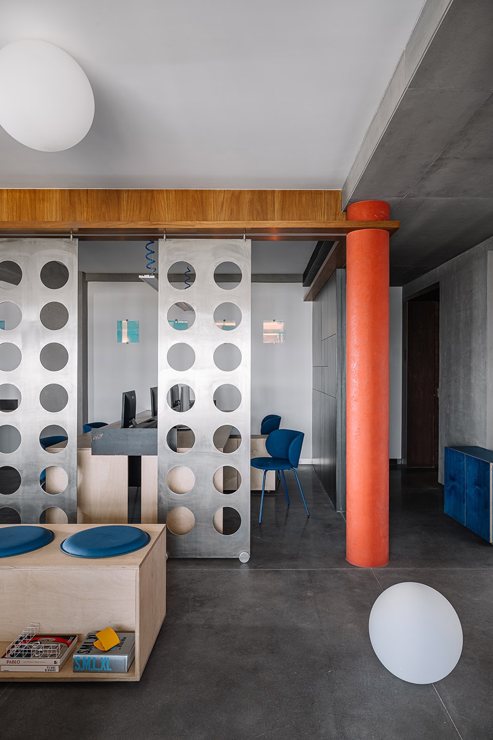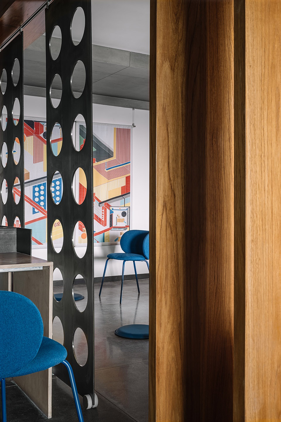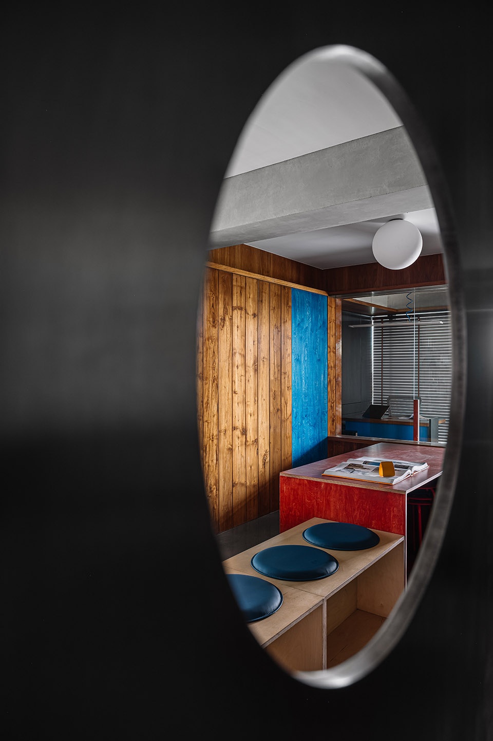 越过工位,首席建筑师的独立办公室出现——这是为专注而设的空间。这里以简洁为主:水平的平面构成可调节的工作台与储物单元,功能与简约兼备。这些桌子可以重新配置,甚至被拆解并改造为新的桌子。钉图钢板墙在此再次出现,既保证视觉连贯,又具备实用价值。面向露台的大窗户引入自然光,营造宁静氛围。办公室有意避免复杂纹理与装饰,突出清晰与实用。但在这里,与工作室其他部分一样,细微的材质变化带来一丝趣味。桦木夹板在不同区域呈现多样处理——有的染成红色或蓝色,有的保持自然原色——在专注氛围中增添层次感与趣味性。