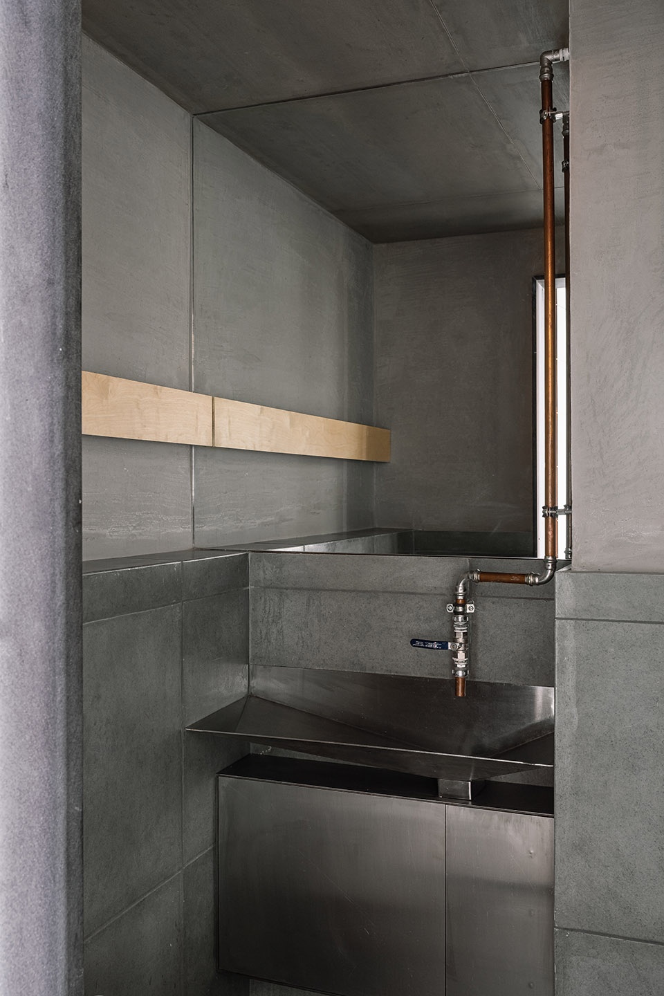 走入中央空间后,平静的灰色调调性渐渐浮现,以其简洁营造氛围。抹灰墙面与骨料混凝土地面构筑了原始、干净的基底。点缀的红、蓝主色为空间注入微妙的能量,形成鲜明而有目的性的对比。木材、桦木夹板、低碳钢与不锈钢构成了其余的材料语言,组合成诚实、实用的表达。空间的核心是一件由夹板与金属打造的简约家具。乍看之下,它只是一个简单的矩形体块,但其真正的魅力在于多变的功能:它既是储物台面、座位,也是讨论桌与工作台,悄然成为房间的主角。