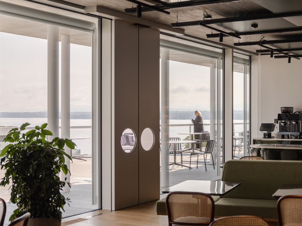 Diverse work environments balance privacy and individual focus with collaborative activities. Communal employee areas such as two double-height collaborative spaces and the restaurant face Lake Geneva, offering uninterrupted views that can be enjoyed by anyone in the building for meetings, work, or simple appreciation. These open spaces are intertwined with client-dedicated areas, including client salons that span two floors and overlook the lake.