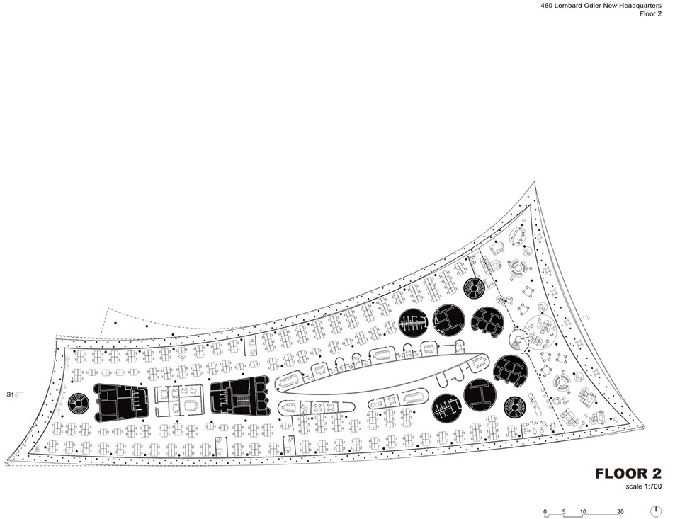 建筑的立面处理方式一致,没有明确的正背面。透明而开放的全玻璃立面最大限度地引入“Grand Paysage”——湖泊、群山与绿色景观。峡谷般的中央中庭两侧布置了会议室,使自然光能够渗透至建筑的最深处。