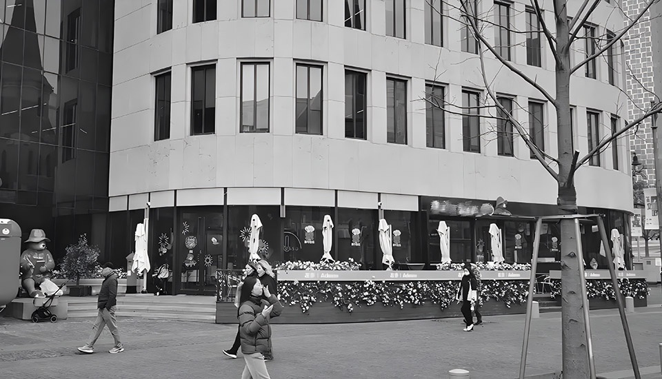 历史街区的更新最忌 “过度设计”。我们希望让新旧元素在碰撞中产生叙事张力,而非简单的风格叠加。层次丰富的街边店面,在众安大楼白净刚硬的大理石外立面之下,衬托得尤为突出。