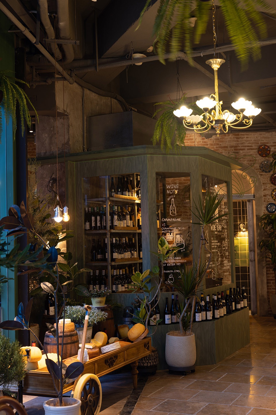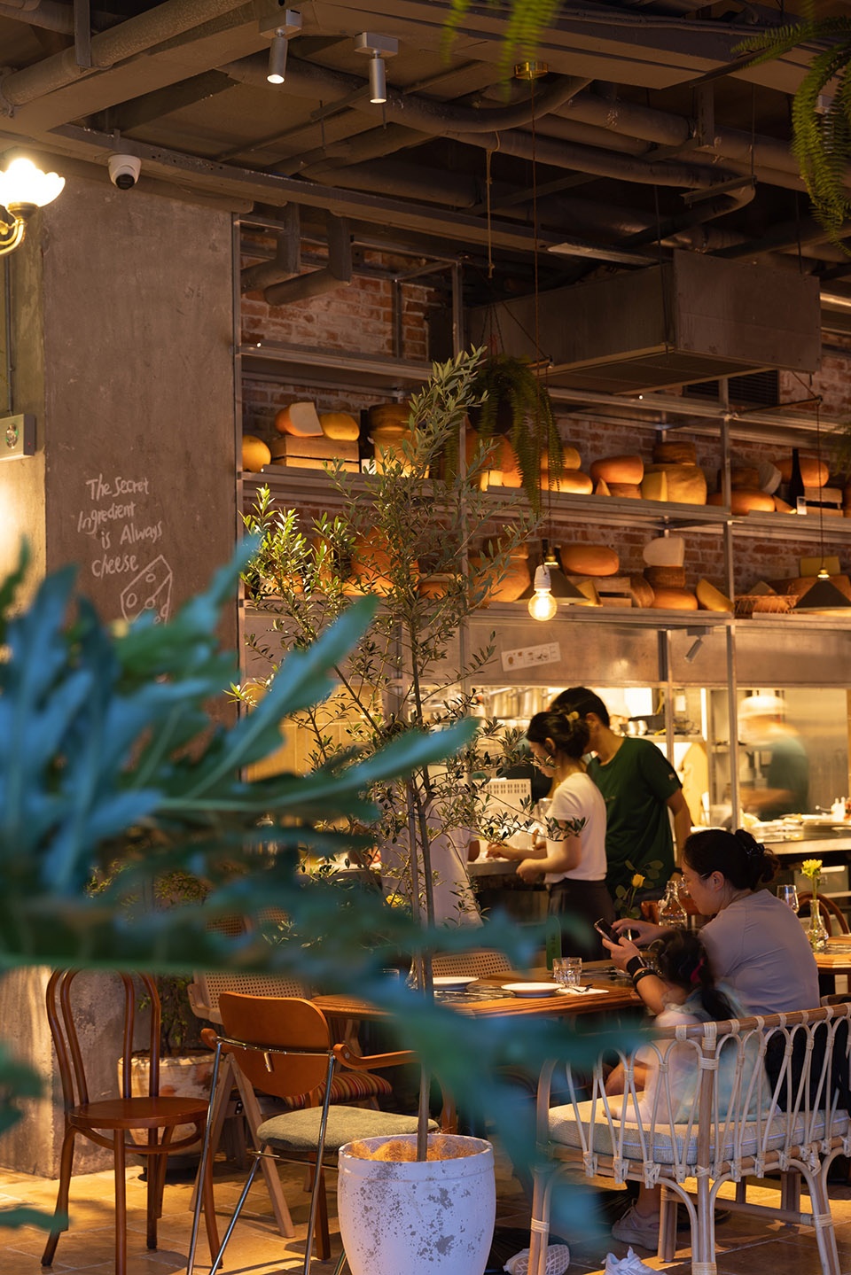 码头工人扛着用麻绳捆的箱子来回走,带点咸味的江风混着奶香味,飘过铁架子和红砖墙仓库,作为空间主色。温润触感再现奶酪制作的工坊场景。搭配天然洞石铺地,呼应着老上海街区的古朴气息。