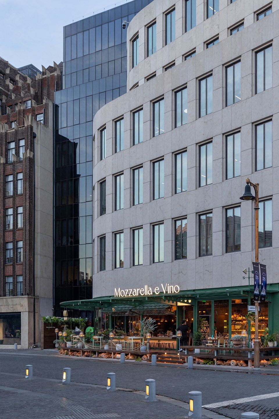 百年Art Deco风格建筑群中,上海Mozzarella e Vino洛克·外滩源店,靠岸在黄浦江与苏州河的交汇处,是欧式风情的 Bistro,在街边开启奶酪与酒的浪漫叙事