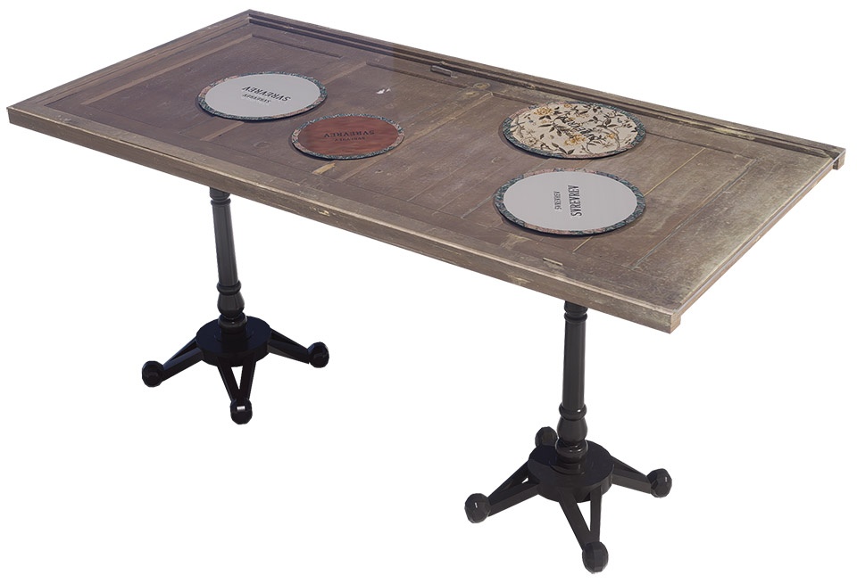 Materials | Concrete, yellow cave stone, galvanized iron sheet, Marine board, old ship elm wood marine plates