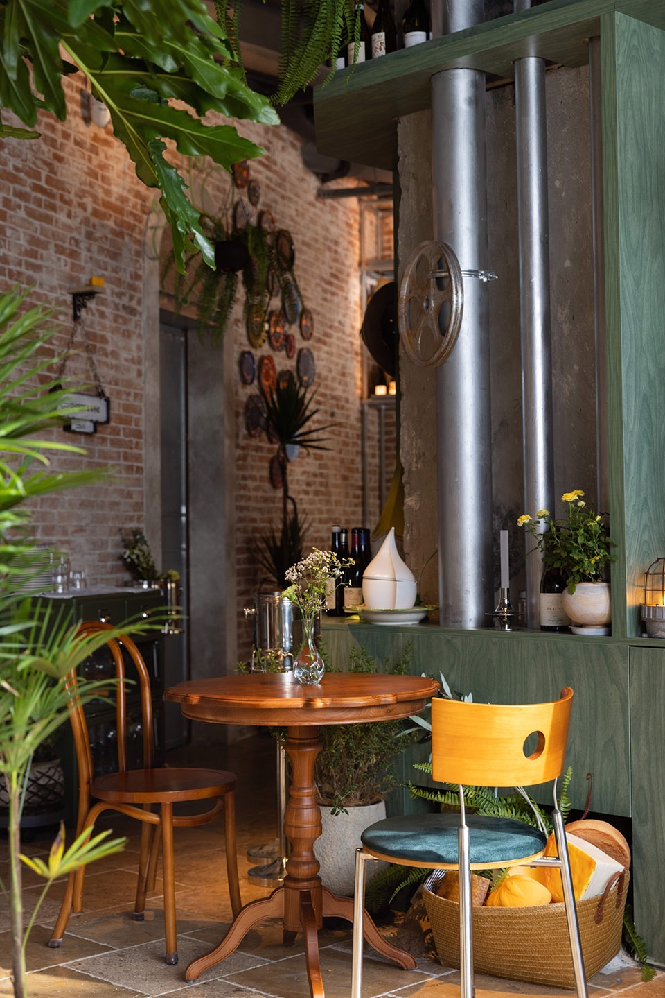 手工烧制的小黑砖在吊灯下微微闪烁,搭配温润的白蜡木,尽显高级的桌面美学。各类原创定制的木制品,擦上“五彩斑斓”的绿。