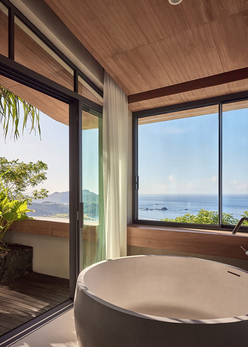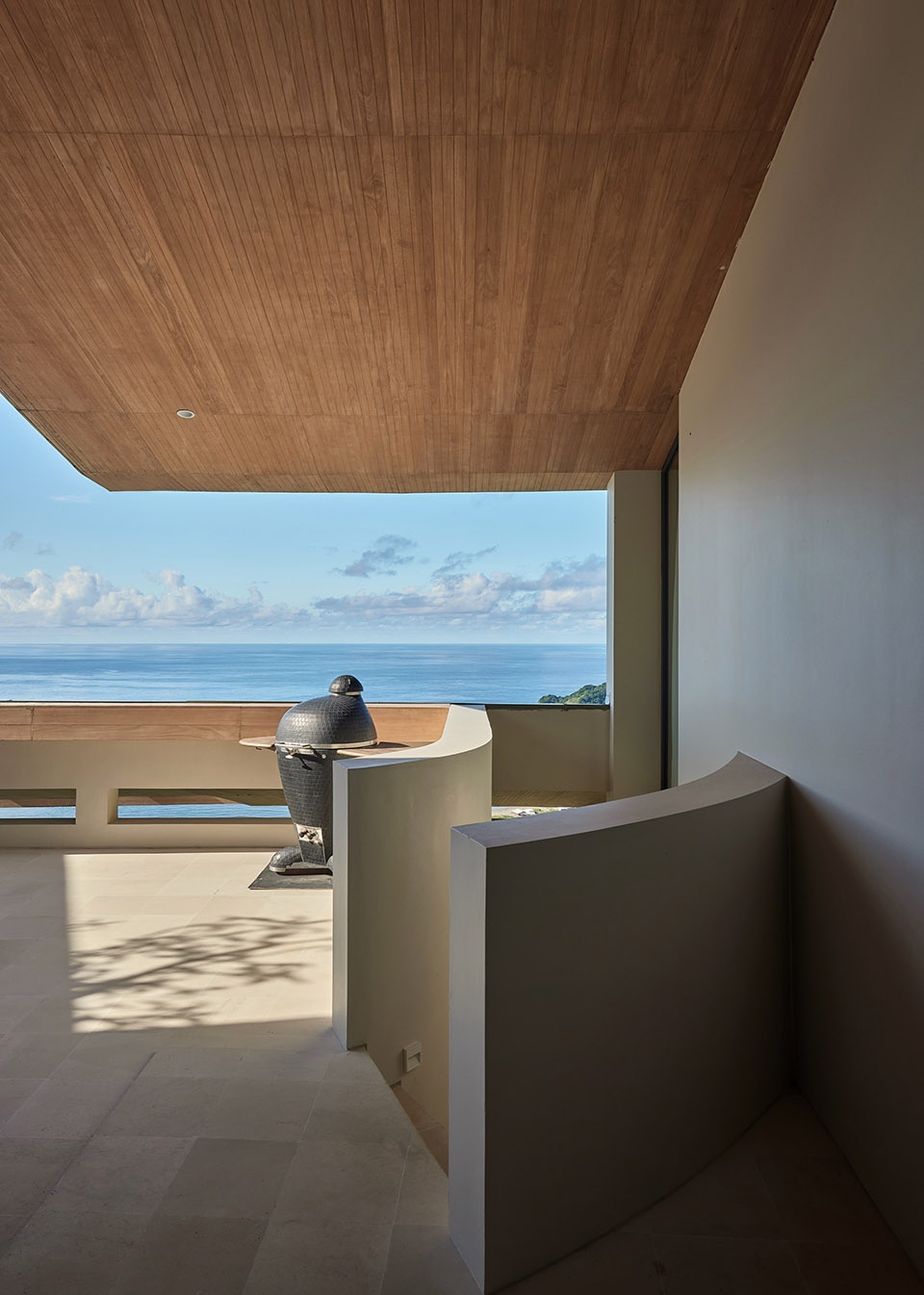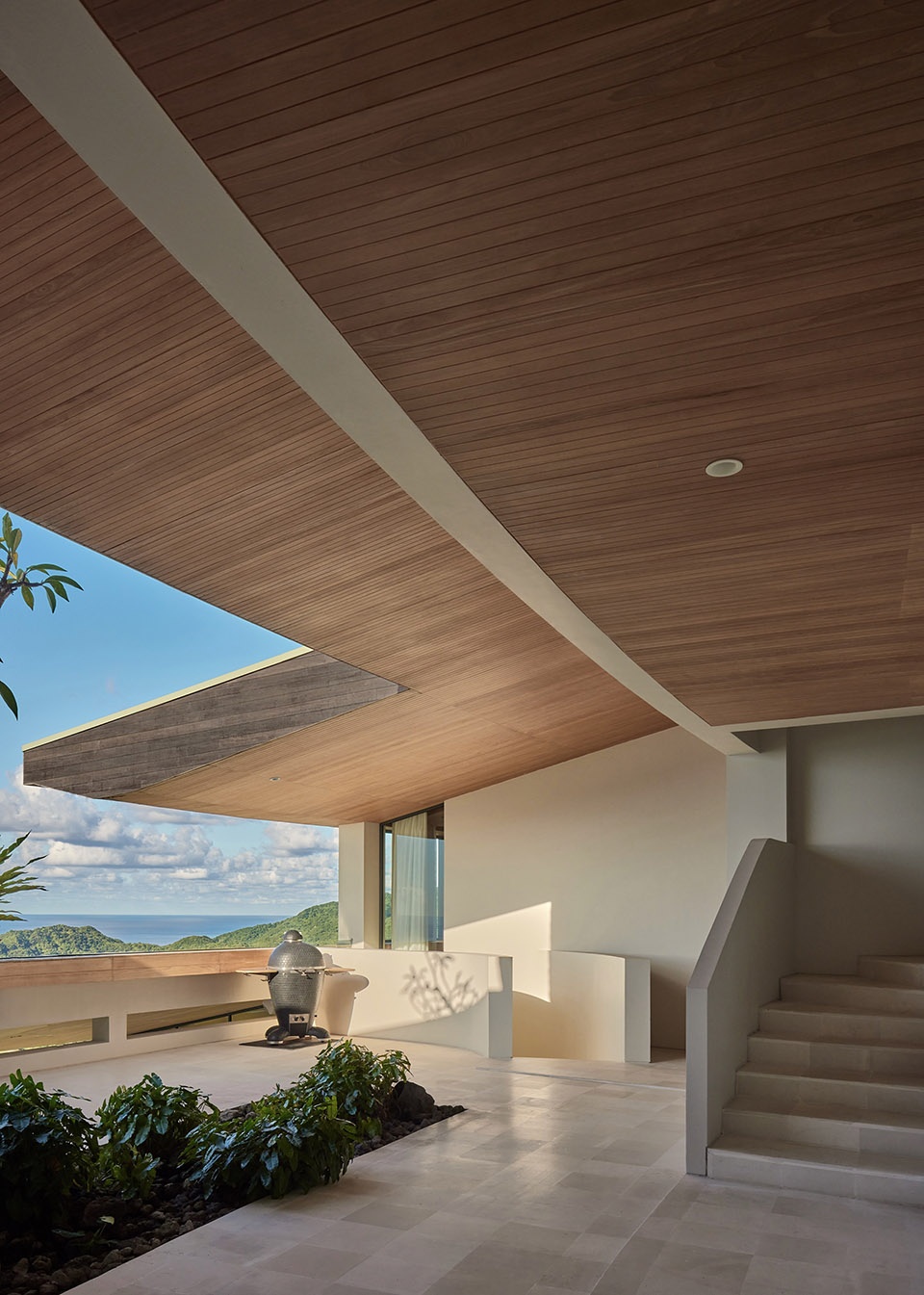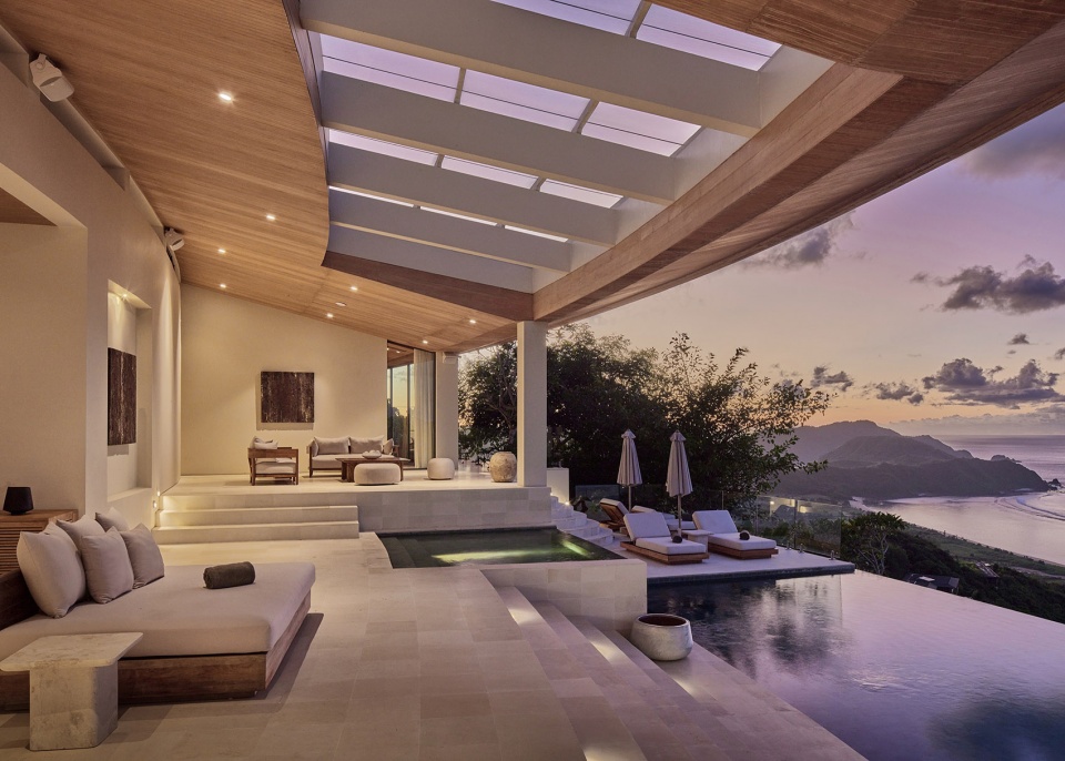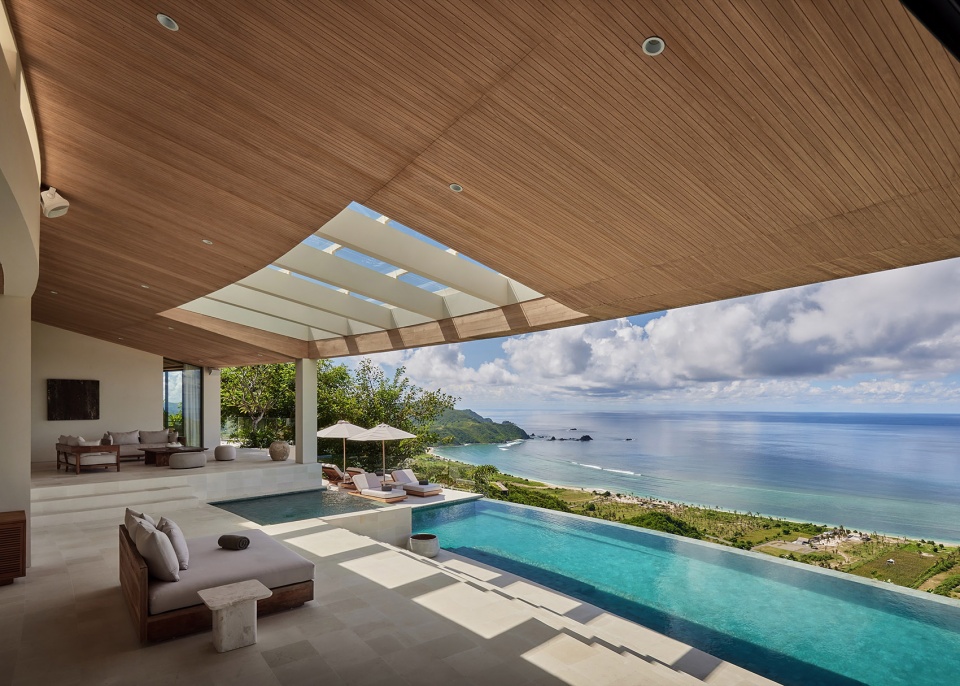 材料保持了克制——柚木用于天花与檐口,米白色的墙面,脚下是白色Palimanan石。这些元素让建筑与气候和自然环境建立起联系,而不显刻意。