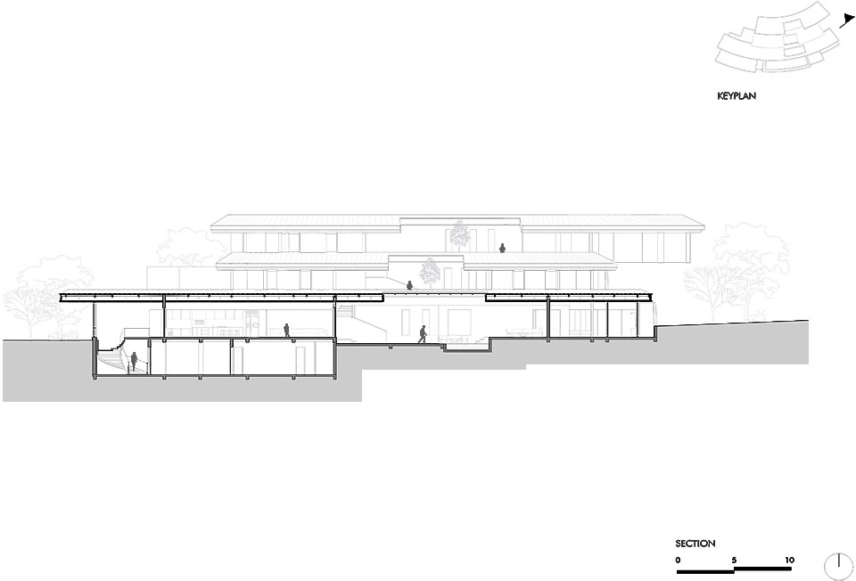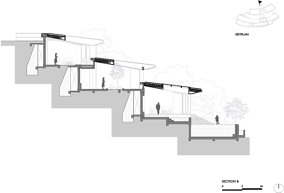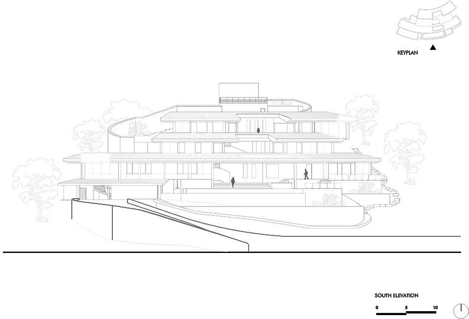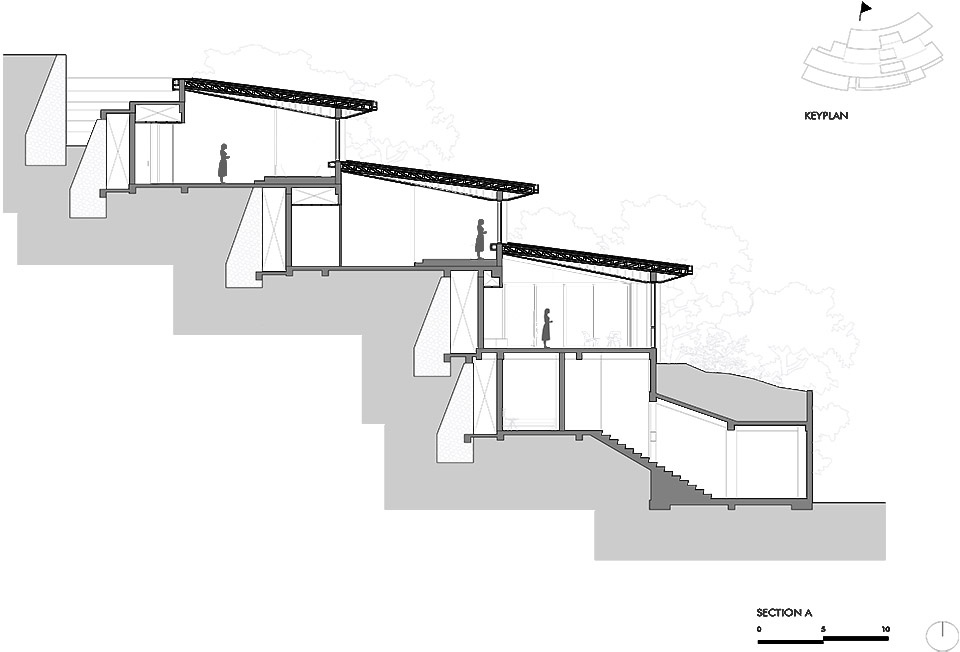 ▼建筑顺应山坡的轮廓展开,The structure unfolds over several levels, adapting to the contours of the hillside