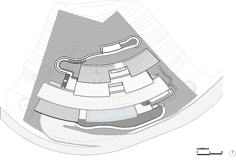 The floor plan is built around a system of concentric circles and radial segments, all oriented around the natural hilltop. This geometry defines how the roofs open up and how the various volumes are positioned in relation to each other. The house reads less as a stacked mass and more as a continuous, terraced landscape.