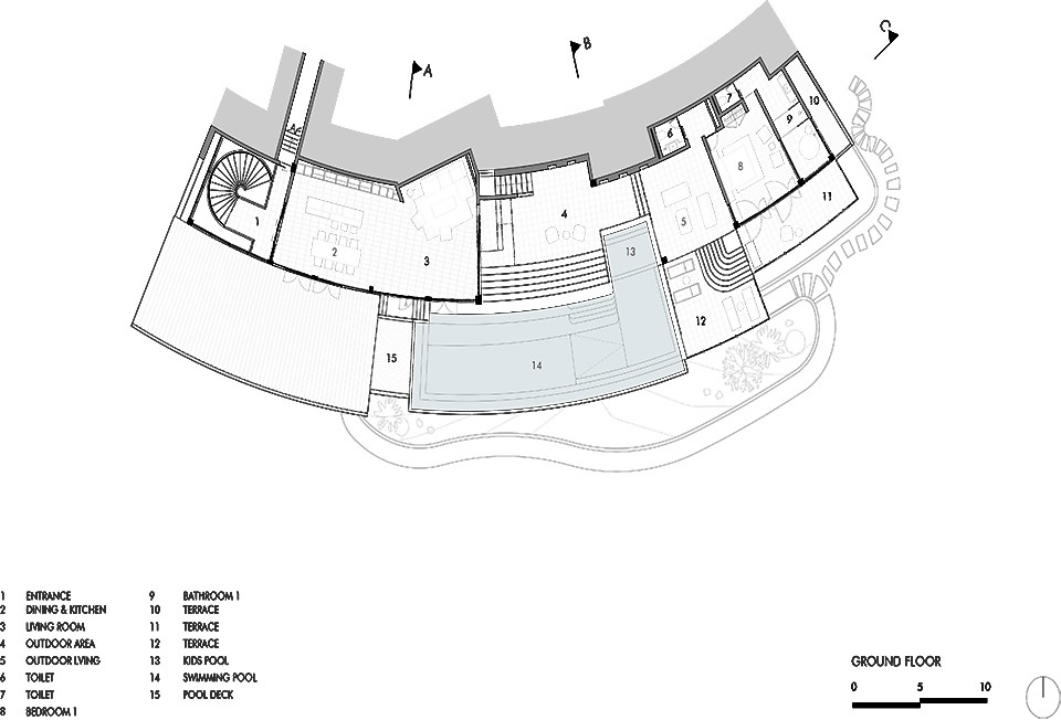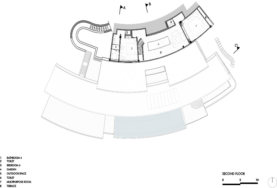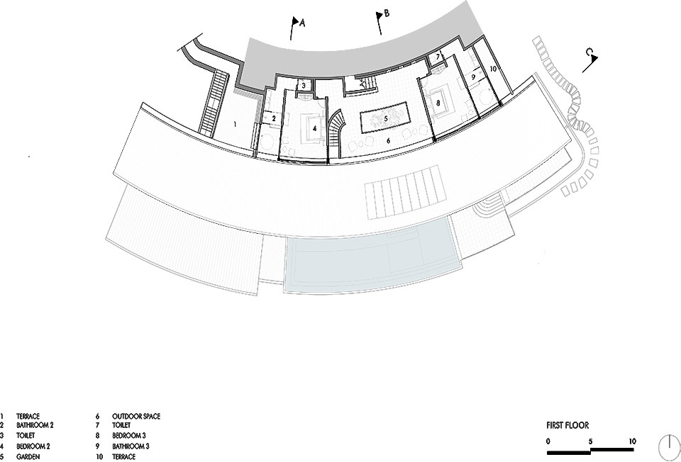 建筑顺应山坡的轮廓展开在多个层面。底部安置了车库与主入口;自此向上,空间逐渐打开至公共区域——厨房、客厅、餐厅——这些空间由一系列台阶与平台相连,进一步延伸至更为私密的部分:两个独立的卧室区,各自为一个家庭而设计。在最高处,一个圆形的瑜伽与静思平台俯瞰群山与海洋——成为一个静谧的所在,让人驻足凝视天际。
