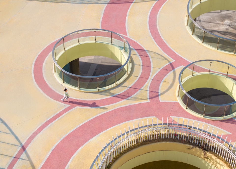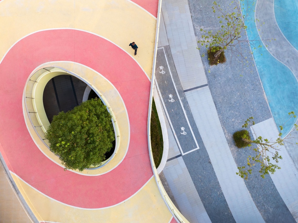 The resulting three-dimensional social space supports a diverse range of community activities. Children play, seniors chat, and parents wait for their children after school. Circular openings of varying sizes—ranging from tree pits to slides—create a lively interplay of light and shadow beneath the platform, activating the space and encouraging interaction.