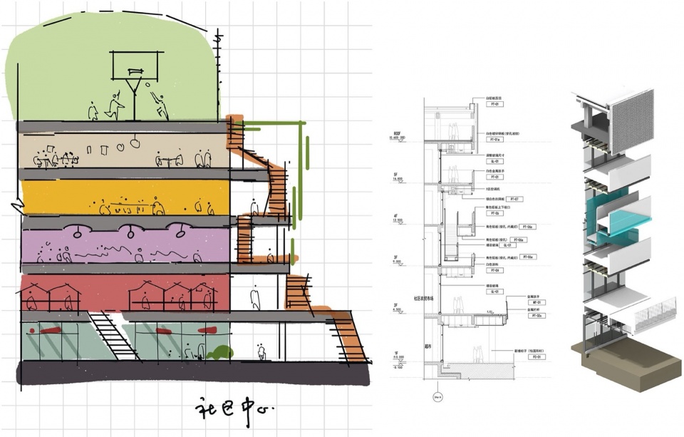我们以颜色作为武器,用一种轻盈的手法,在原来毫无表情的立面上,创造出了活泼而灵动的表情。各栋建筑以不同的主题色,呼应这里丰富的社区业态——政府服务,餐饮商业,生鲜市场,老年之家,少年活动中心。原来沉闷的穿孔铝板被拆除,换以洁白清新的横线条立面,在青少年宫的楼层,立面被完全打开,焕新成围绕四周的外廊,让流线空间完全外化。孩子们在盘旋而上的楼梯上下跑动,成为立面上最有趣的风景。