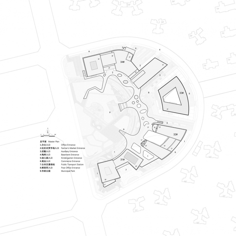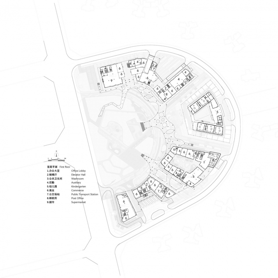 基地围绕着一个半圆形的市政绿化带。解题的思路,在于把四栋建筑物围绕的市政绿化公园作为空间焦点,以一个舒展的二层平台,将光秃秃的建筑物连成一体。整个建筑群的姿态和面貌,由于这个简单而坚定的动作,发生了180度的改变。每栋建筑都张开双臂拥抱公园,能量焦点聚集在一起。