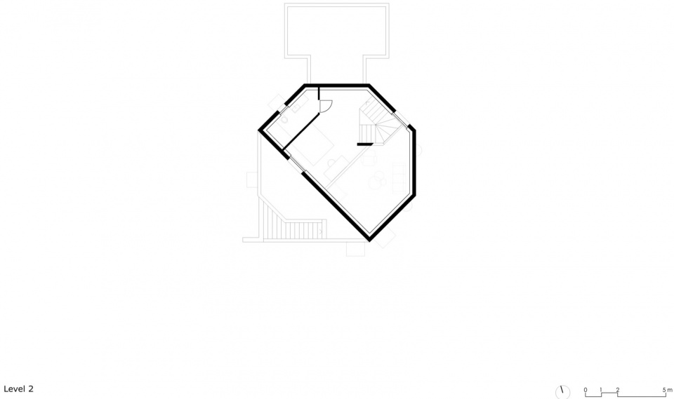 规则多边形的中断仿佛是一种开凿——从精准的原始体量中减去物质。它如同一块大石,被雕刻以创造最佳朝向,为内外过渡区的生活提供空间。人眼本能地完成原本的八边形形式,填补空白。