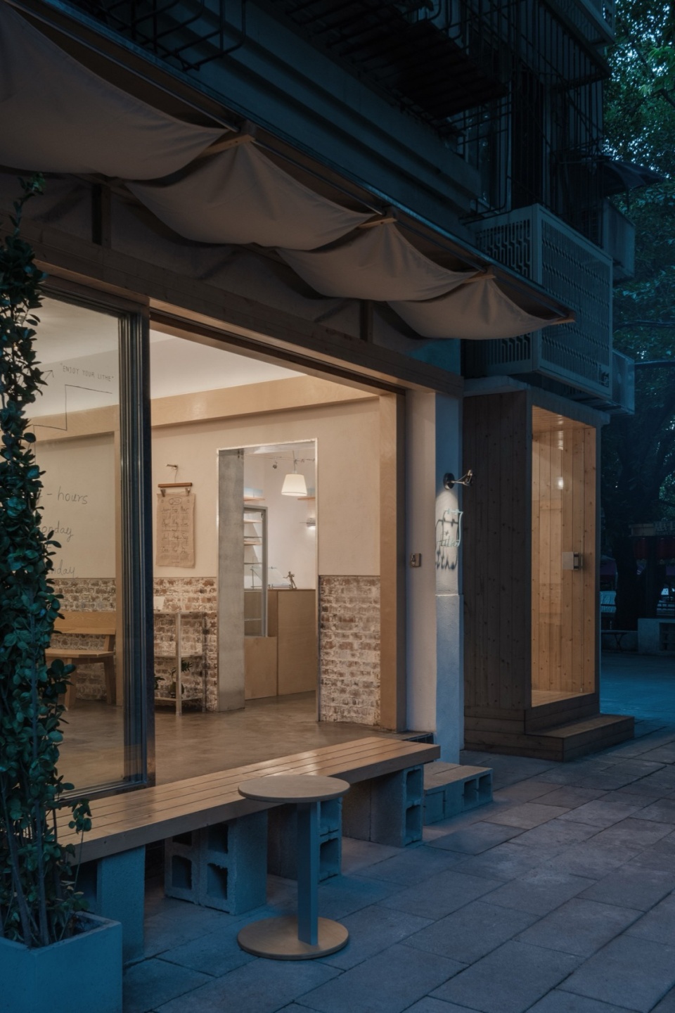 The space maintains an open connection to the street, allowing natural sunlight to flood in and fostering a closer relationship with everyday community life. The awning takes inspiration from a familiar neighborhood scene—the sight of bedsheets hanging out to dry. Made of pine, galvanized metal, and fabric, it not only provides shelter from rain but also brings the familiar textures and rhythms of daily life into the space.