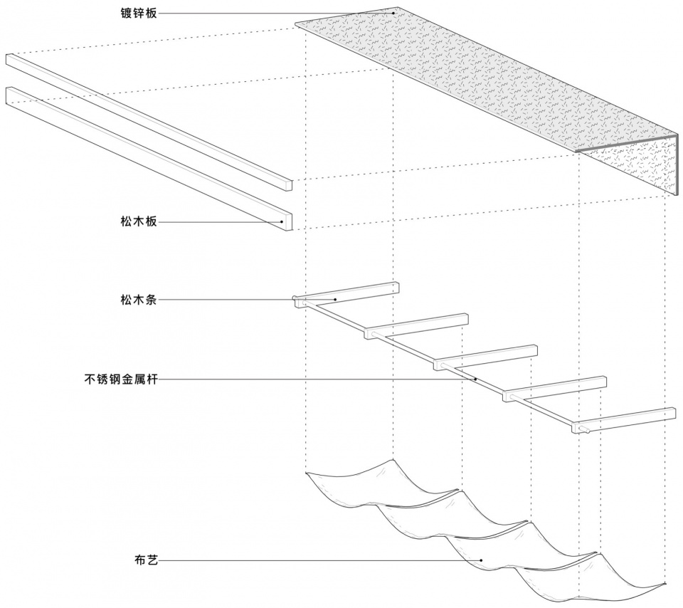 堂屋与街道之间保持开放,阳光自然涌入,也让空间更贴近社区生活。关于雨棚,我们以老社区中常见的晾晒床单的景象作为设计概念。以松木、镀锌板和布艺组合而成的雨棚装置,既解决了挡雨的功能问题,又延续了熟悉的生活气息。