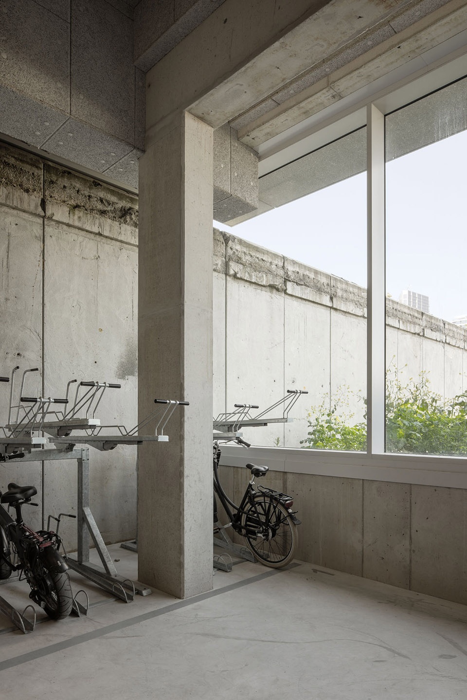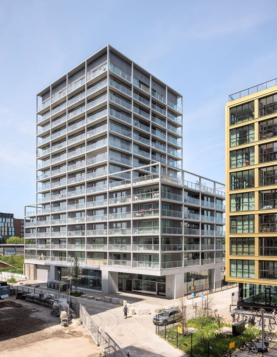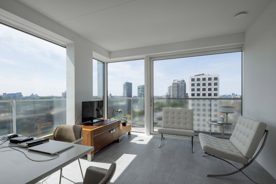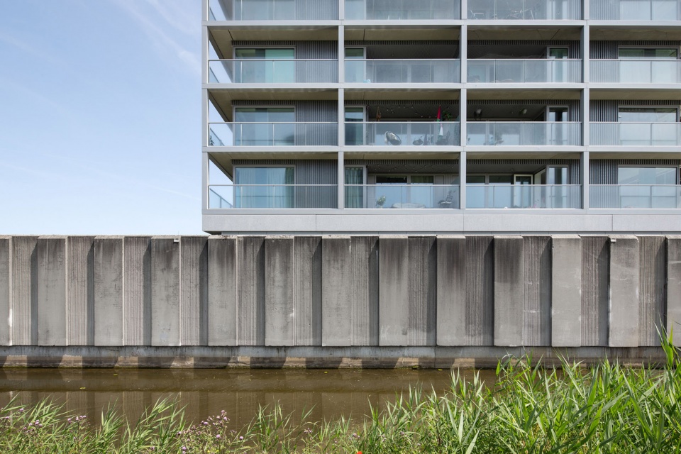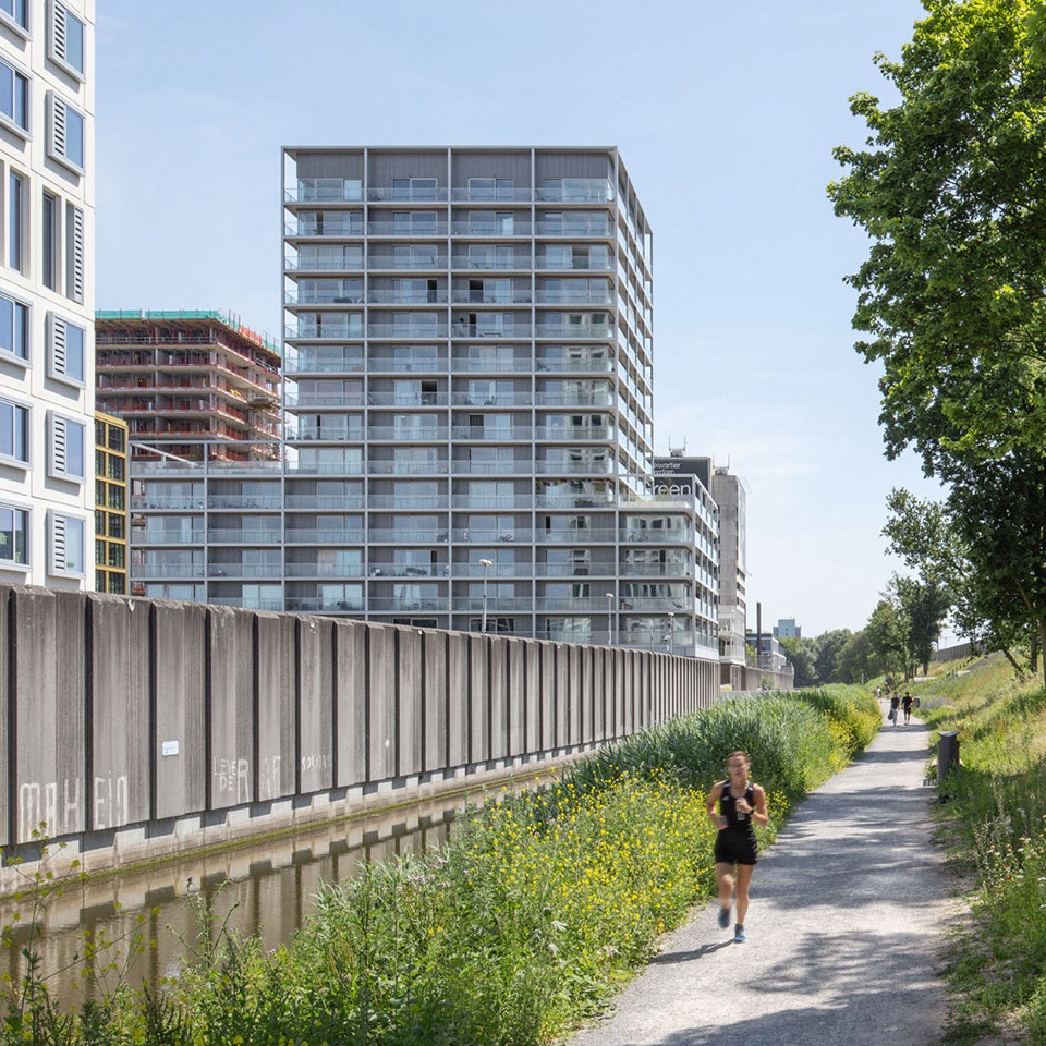 为实现经济建造,设计自始即融入多项措施:每层最多14户的紧凑布局;仅设两部电梯与两处楼梯的高效交通核;紧凑的外壳;标准轴线尺寸,方便高预制率的系列化建造;环绕阳台兼作施工脚手架,大幅降低建造成本。得益于外壳混凝土的设计,室内装修成本被降至最低。建筑的紧凑性同时也提升了物理性能。外立面采用三层太阳控制玻璃,并由阳台被动遮阳。所有公寓均接入冷热系统,确保夏季舒适。整体能耗比荷兰已相对严格的BENG标准低约20%(约24kWh/m²)。所有屋顶均为绿色屋顶,增强生物多样性并储存雨水;最高屋顶还布置了光伏设施。结构寿命预计至少100年,并在户间隔墙中预留无钢筋区,方便未来合并公寓。此举为创立于1868年的阿姆斯特丹住房公司 De Alliantie Ontwikkeling B.V. 提供了在22世纪仍可转型的良好基础。