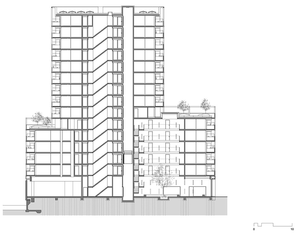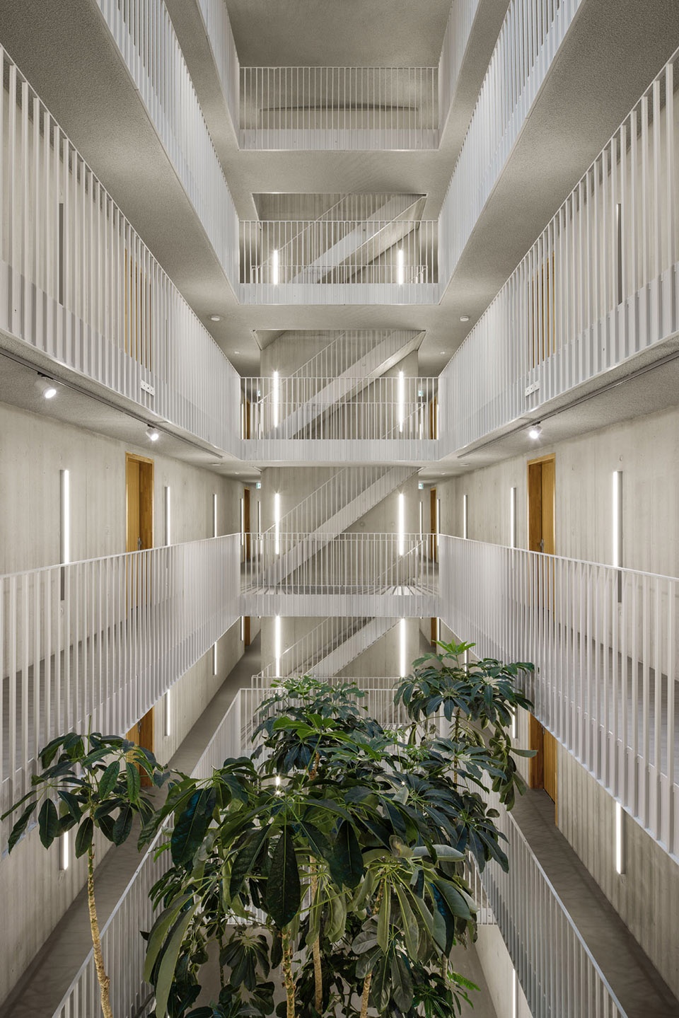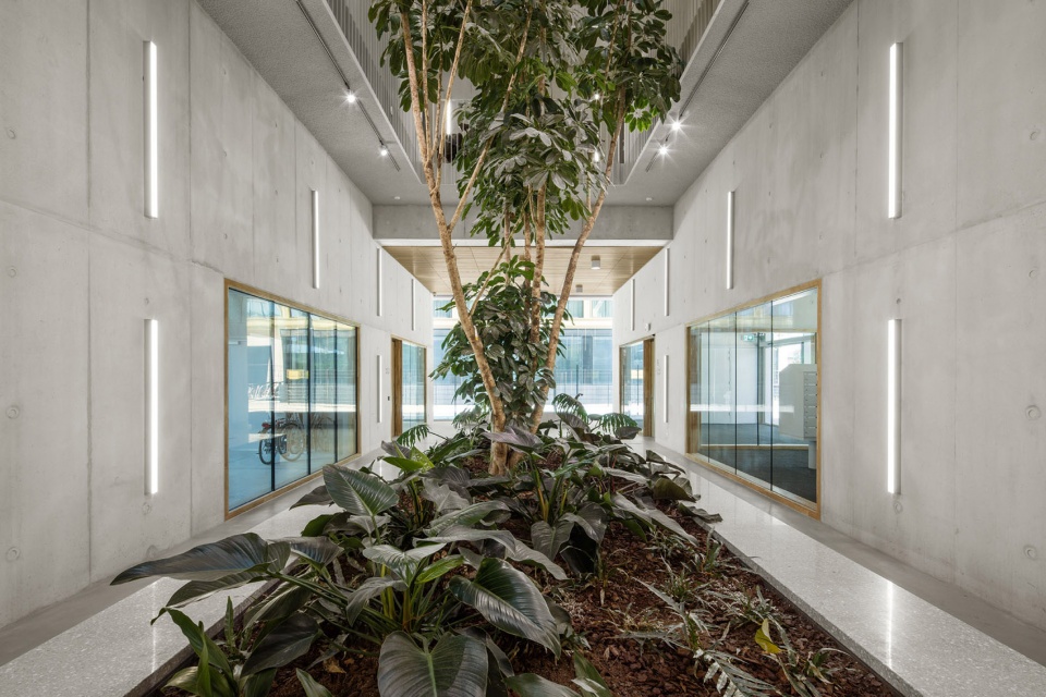为了增强约300名居民的共处感,建筑的公共空间被设计得宽敞而具吸引力。一层层高4.5米,形成通透的视线,将多样的室内空间与绿色环境相连。材料选择既高品质又坚固耐久:裸露混凝土墙、抛光混凝土地面,以及橡木与水磨石。基座中央布置了一个绿植大厅,其中种植了一棵高达11米的树木。其上方展开六层高的中庭,引入自然光,并设有开放楼梯。基座屋顶还为居民提供两处公共屋顶露台,基质厚度达80厘米,栽植5米高的树木,未来将形成一个宜人绿色景观。通过这些措施,建筑试图营造出一个庆祝集体性、促进交流的氛围框架,孕育一个鼓舞人心的社会“微观世界”。