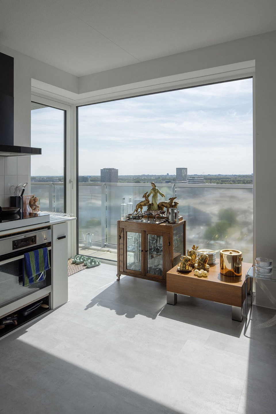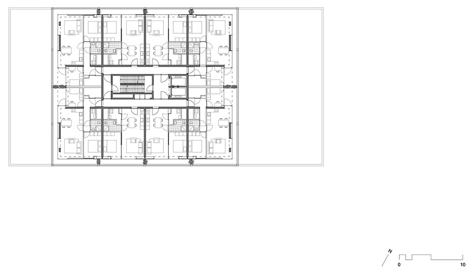 The apartments in the building—corresponding to the current economic circumstances—are rather or very small. To utilize the space available as effectively as possible, only open kitchens are provided, and entrance halls and corridors are dispensed with in the case of the smallest apartments. Along the façades, sliding walls are installed in part so as to form small enfilades. The façades are glazed down to floor level in order to expand the apartments spatially toward the outside and make them appear roomier. All the apartments also have a circumferential balcony, which can be accessed via a sliding window of 2.3m x 2.3m in dimension. The corners of the building are designed in an open manner so as to engender lightness both inside and outside. On the whole, an attempt is made to consciously make use of the C.I.A.M. principles such as light, air, and panorama in the interior space as well. The aim is to show that a certain spatial luxury is also possible in social residential construction.