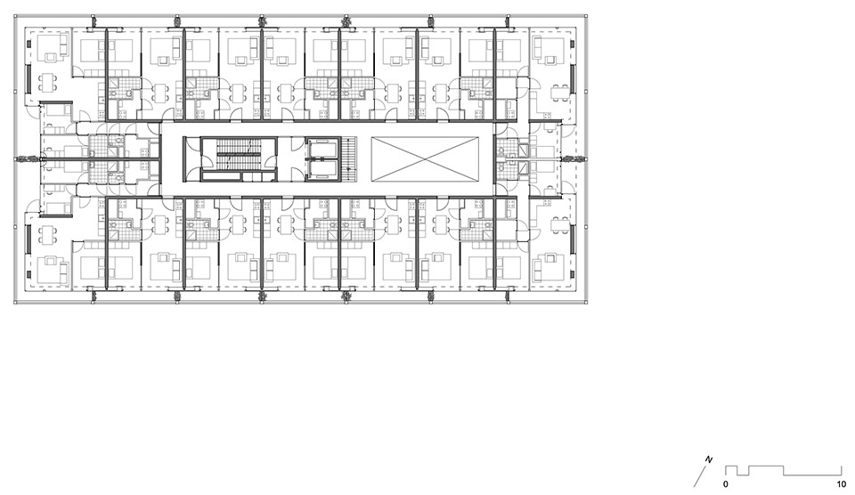 For Construction Field F, with 140 apartments, a strategic combination of two architectural prototypes is proposed. The bottom six stories are designed as a very compact base of 49.5m x 25m. Fourteen apartments per story are thus arranged efficiently around a central atrium. The flexible, multifaceted base contains communal areas, commercial uses, and a spacious bicycle garage so as to facilitate high-quality urbanistic integration of the building into the new urban landscape. Positioned on top of this atrium building is a nine-story, compact residential tower of 29.5m x 25m. Eight apartments are situated on each story, arranged around a double staircase and two elevators. The result is a new, sculptural prototype that is also derived from the urban development requirements and the dialogue with the other buildings in the cluster.