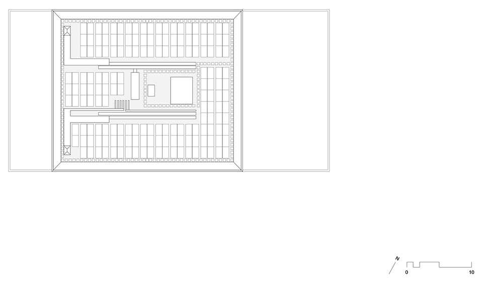 建筑设计在很大程度上受制于如何将历史监狱围墙纳入整体构图,以及如何在公共广场角落形成一个重要入口。基座因此在多个位置采用大挑檐,底层以六根厚重的“柱脚”和厚板支撑,营造出悬挑桌面的结构意象。立面以抛光水磨石构件表现足够的视觉厚重感,同时也呼应预制混凝土的灰色监狱围墙。整栋建筑“托举”在这一“桌面”之上,自此向上逐渐过渡为金属网格化的阳台立面,呈现轻盈对比。开敞的转角、环绕露台的轻质廊架以及高挑屋檐共同塑造了介于垂直与水平之间的张力,在城市厚重感与现代轻盈感之间寻求平衡,契合新城区的特质。