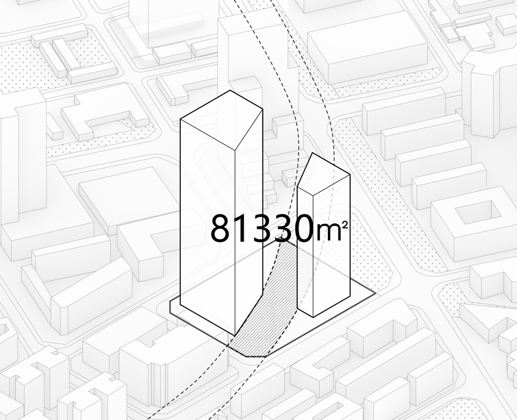 The project is situated in the Meilin-Caitian area of Shenzhen, on the northwest side of the intersection of Kaifeng Road and Meihua Road. It is connected to Meilin Road, a major urban arterial road, to the north, and to Kaifeng Road, a secondary urban arterial road, to the east. To the south, it is adjacent to the North Ring Expressway, a city expressway. The site is regular in shape, bordered by a community park to the east and offering a distant view of Lianhua Mountain Park to the south. However, the diagonal passage of the subway poses significant challenges for the architectural layout. If the contour is controlled along the diagonal tangent, it would result in impractical oblique building planes. Moreover, the above-ground architectural layout does not benefit from the subway’s diagonal passage in terms of creating better opportunities. We aim to address this unnecessary drawback through design.
