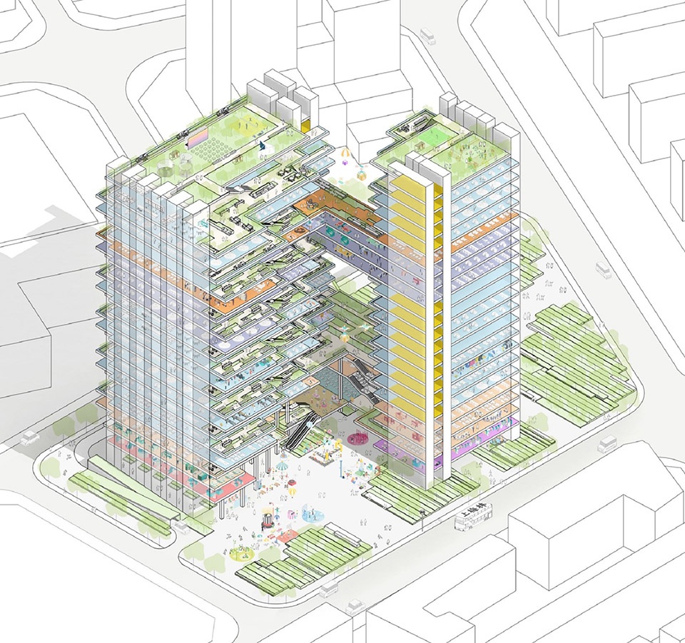 This is an office community formed by the interweaving of floor slabs and cantilevered platforms, grouped vertically. The building breaks away from the enclosed, rigid silhouette of traditional high-rise offices, bringing nature and daily life back to every floor. The easily accessible eaves spaces evoke emotional responses, creating a dialogue between space and time. Beyond work, we encourage everyone to step out of their offices and onto the “community balconies” to fully engage with others and with nature. When professionals in the office building share a vertical village with longtime residents, this lifestyle is not a meticulously designed theme park nor a utopian forced integration—it is a community with a shared sense of identity.