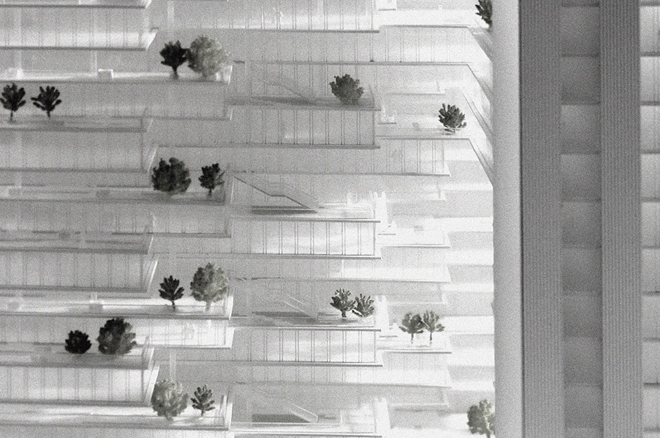 In the lower section, we accentuate the building’s multifunctionality and openness by integrating greenery with public spaces beneath deep overhanging eaves. The flat eaves lend a sense of visual lightness, while the southern shadows serve as microclimate stations along the streets, subtropical social catalysts, and free communal living rooms for citizens.