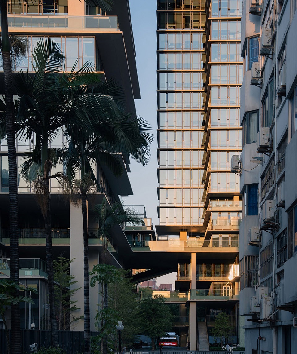低区,我们强调建筑的复合功能与开放性,并将绿化与深挑檐下的公共空间结合,平坦的檐口给人轻盈的视觉感受,南方的阴影是街头的微型气候站,是亚热带的社交催化剂,是市民的免费客厅。