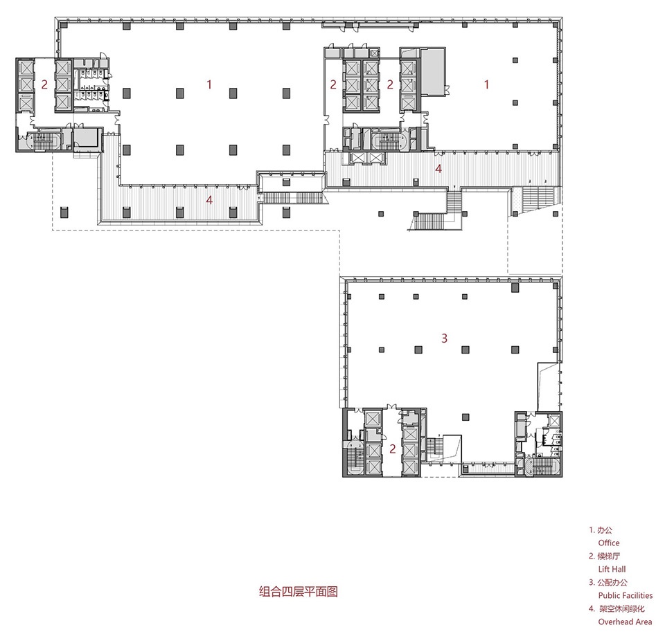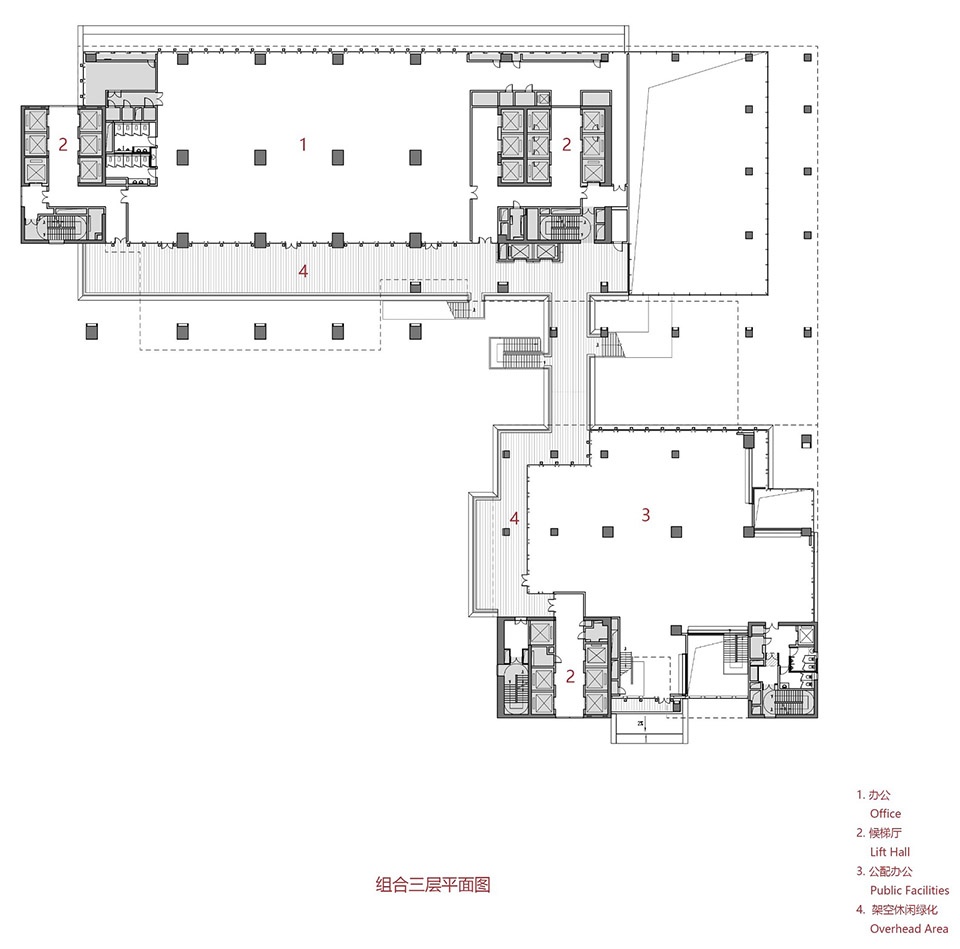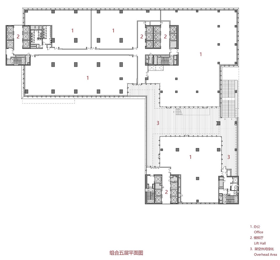 定义一个建筑生成的模数,清晰界定服务空间与被服务,作为灵活使用的大平面适应办公生活的多样需求,控制服务空间的边界,并为其生长界定边界。垂直方向定义四个“零层”为高密度社区提供空间补偿。在这个基础之下,工作与生活将继续塑造建筑,与其说我们是在设计一座建筑,我们更愿意称之为在建造一个中性框架系统:水平南方的檐下空间正在参与与融入随机又秩序井然的梅林的社区环境,它忠于个体欲望,产生丰富的多样性,展现旺盛的生命力。