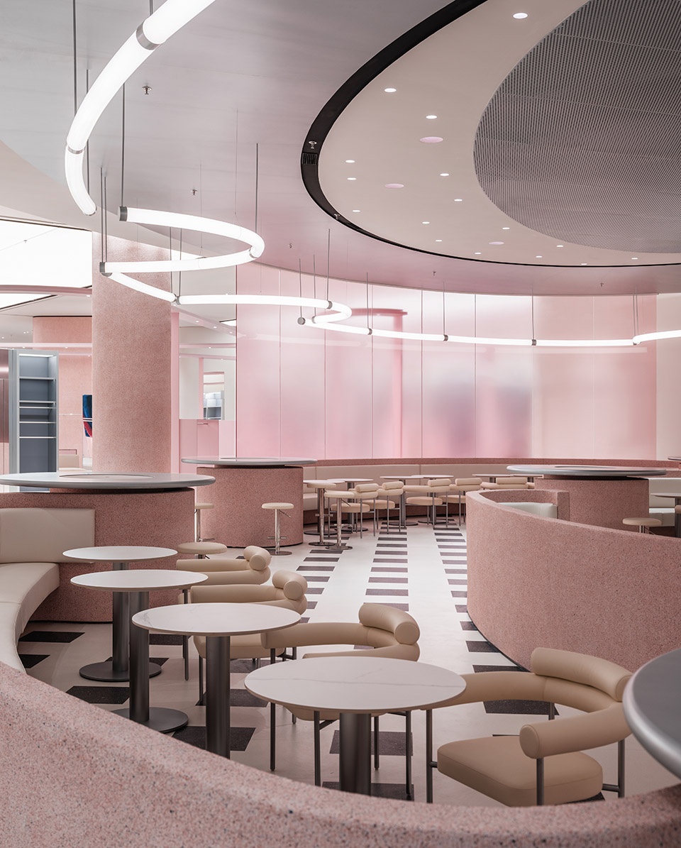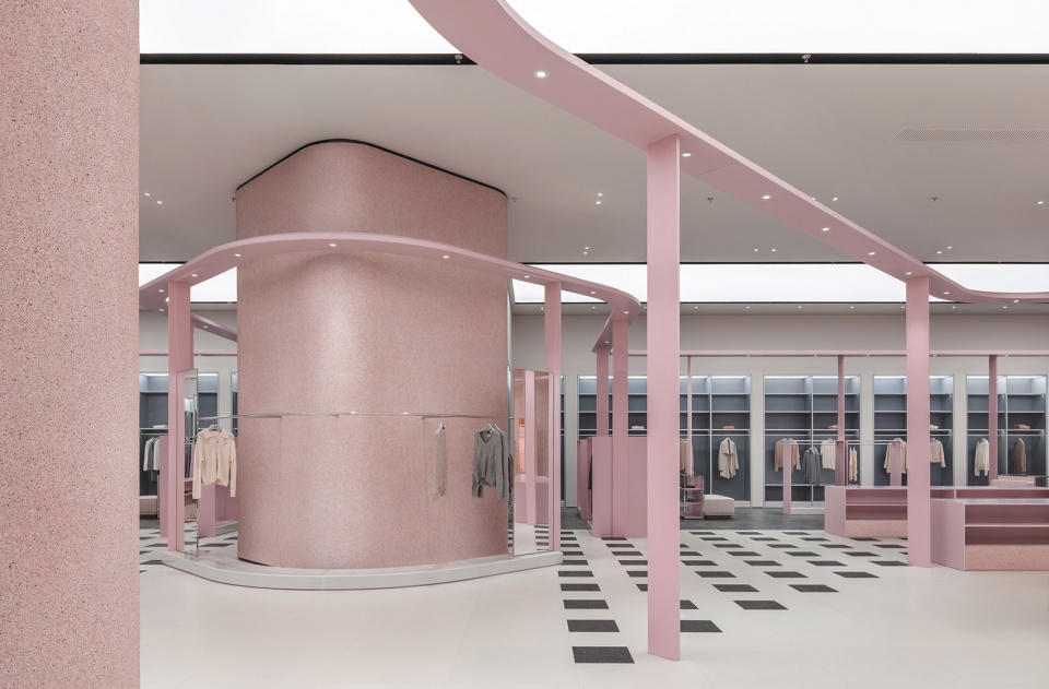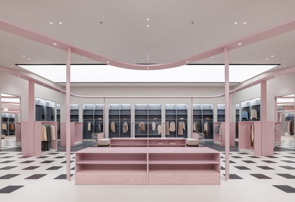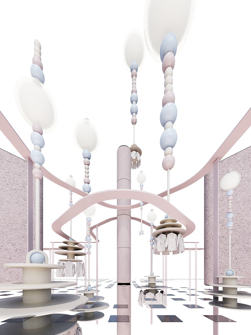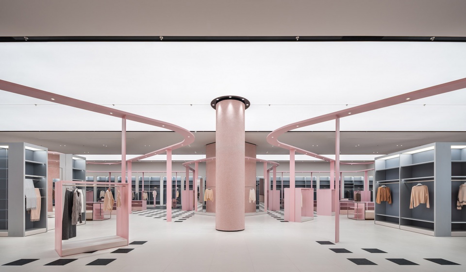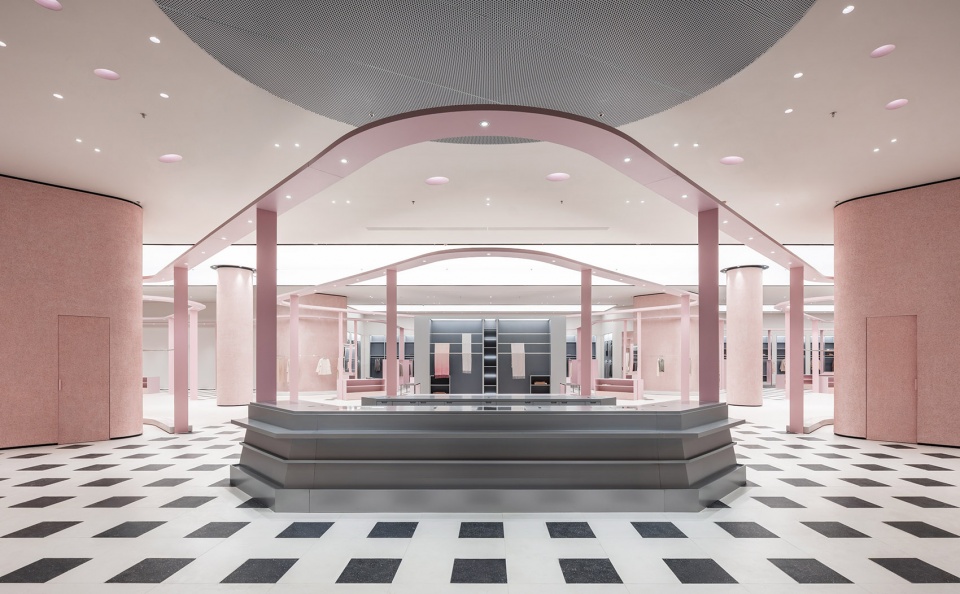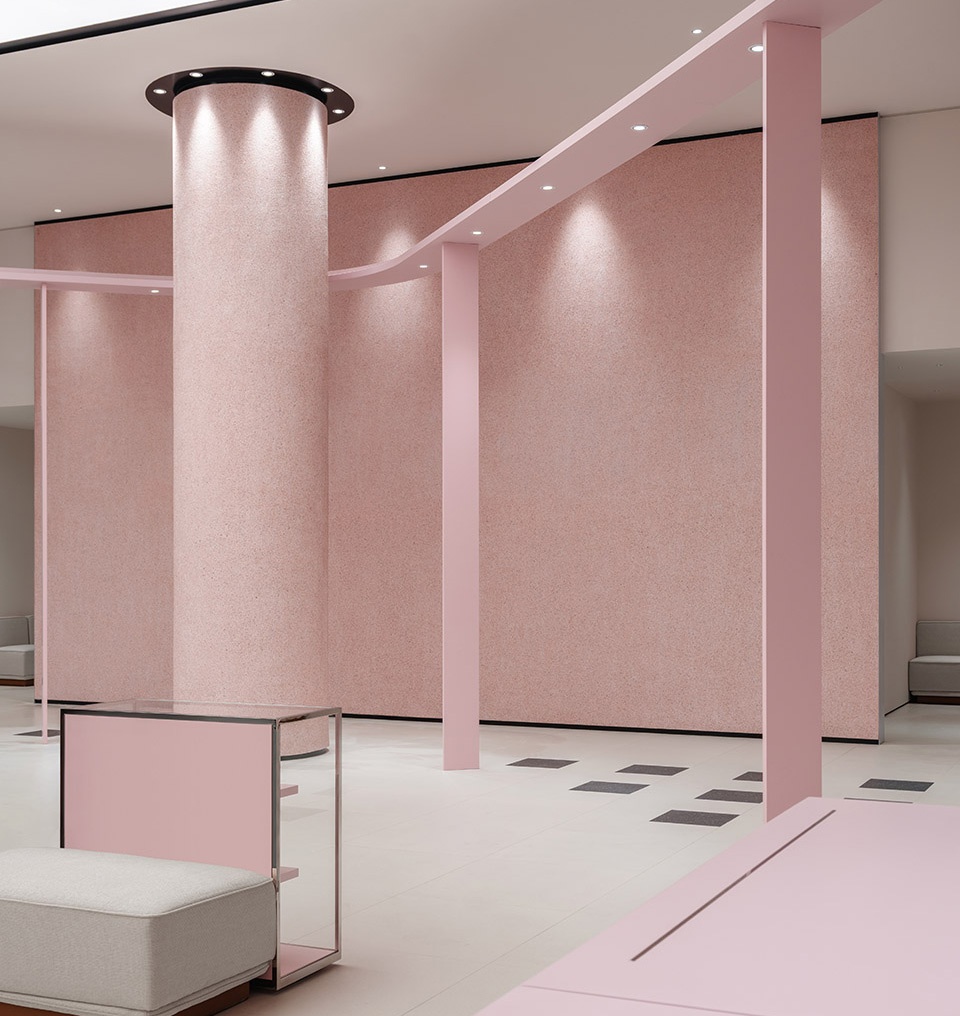 设计中粉色调的环境柔化了空间氛围。这些色彩的搭配产生出微妙的光学振动,让空间显得更加轻盈、富有趣味。特意挑选的颜色旨在传递欢乐与愉快的感受。通过强调高光色调,同时让色彩自然交融,确保了服装始终成为视觉的焦点。