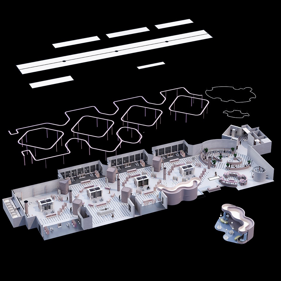 A Tall continuous pink, pigmented, ribbon-like rack acts as the central device. It supports the task lighting for booths, provides wayfinding to guide visitors’ engagement through the shop, and frames as well as controls the inevitable high quantity and scale of items to be displayed in this factory store.