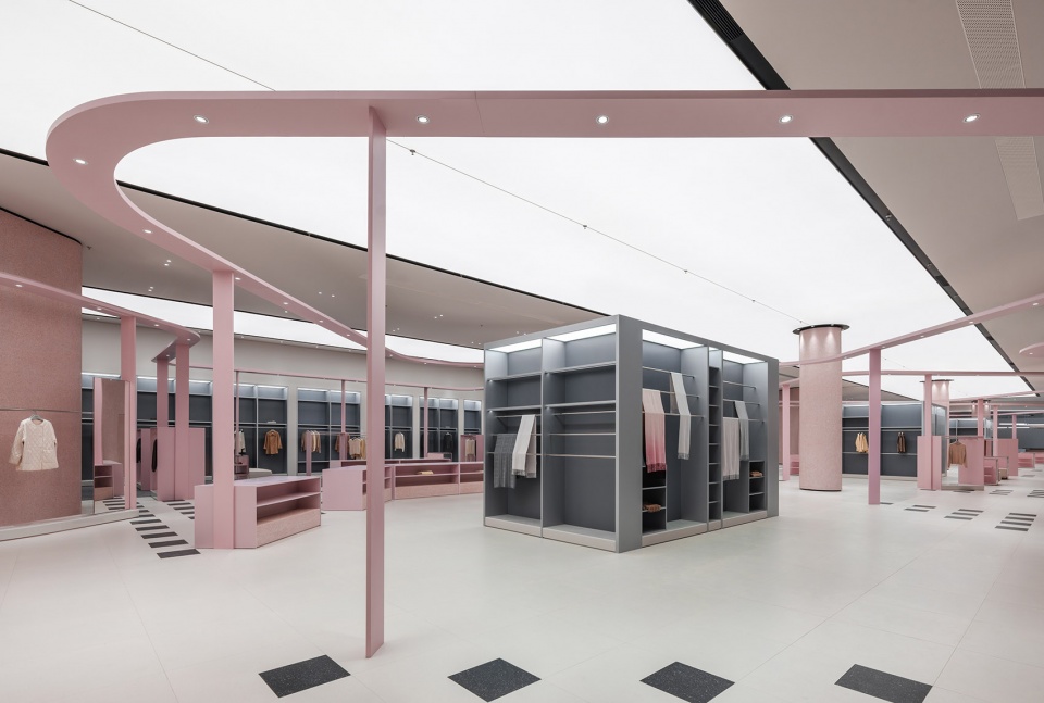 一条连续的高耸粉色丝带衣架贯穿空间,既是核心展示装置,也承担着照明和引导动线的功能。它不仅提供展位所需的光线,还巧妙引导顾客在店内的移动路径,有效应对了超大型零售店中商品繁多、展示规模大的挑战。