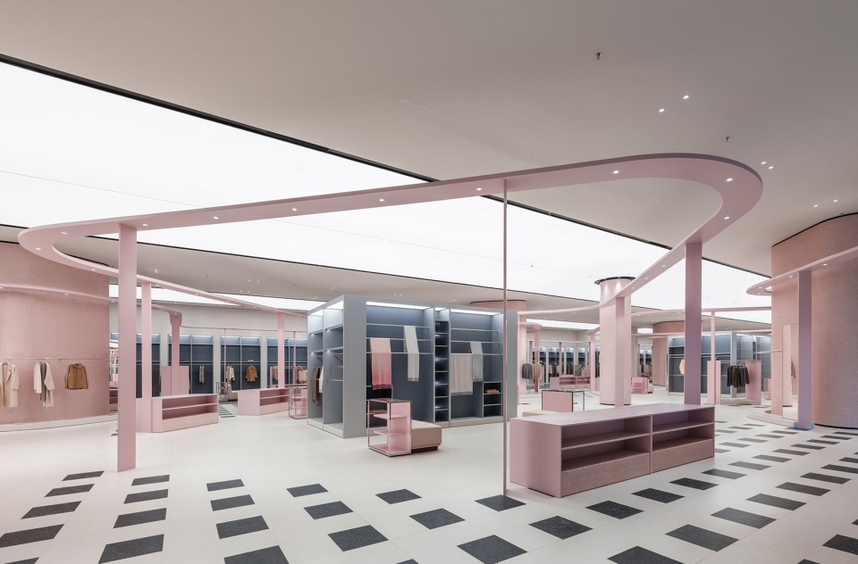 作为品牌目前最大的单层零售空间,该店预计在高峰期每日可接待超过700名顾客,展示超过4000件商品,涵盖五大品牌系列。动线设计成为关键:平面布局以四个中央岛台为核心,使购物过程既可以形成连续的循环体验,也可以通过相互连接的“8”字形路径完成。