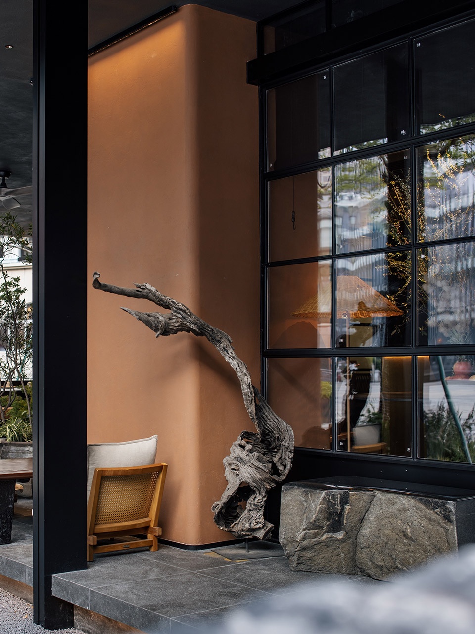 The black stone extends from the courtyard entrance all the way indoors, using black as the base to highlight the wooden box.