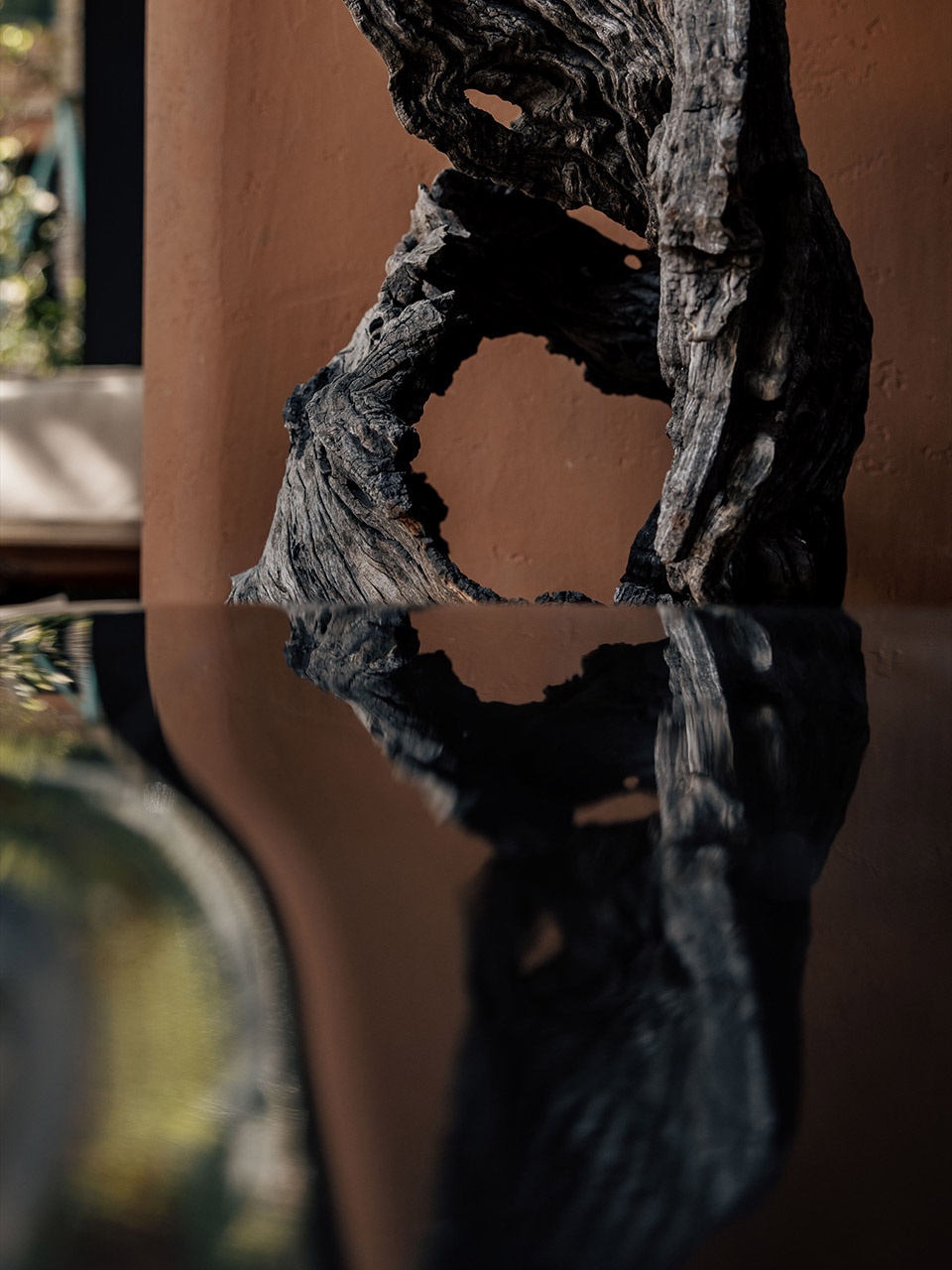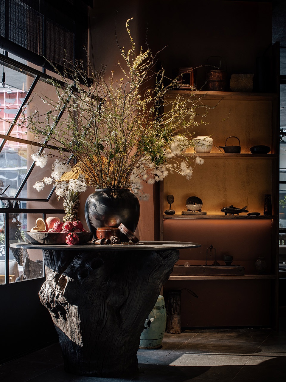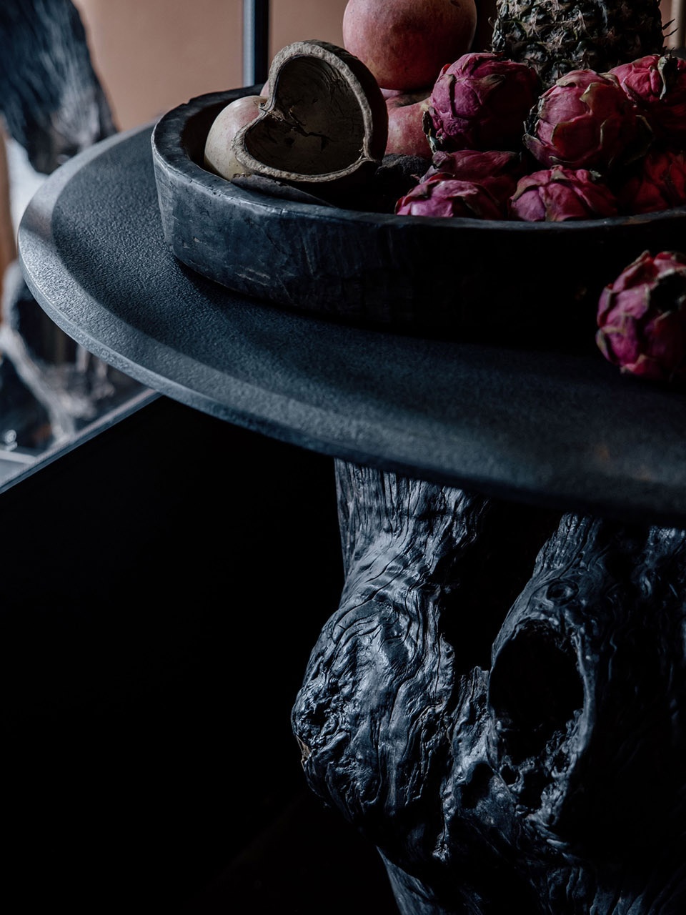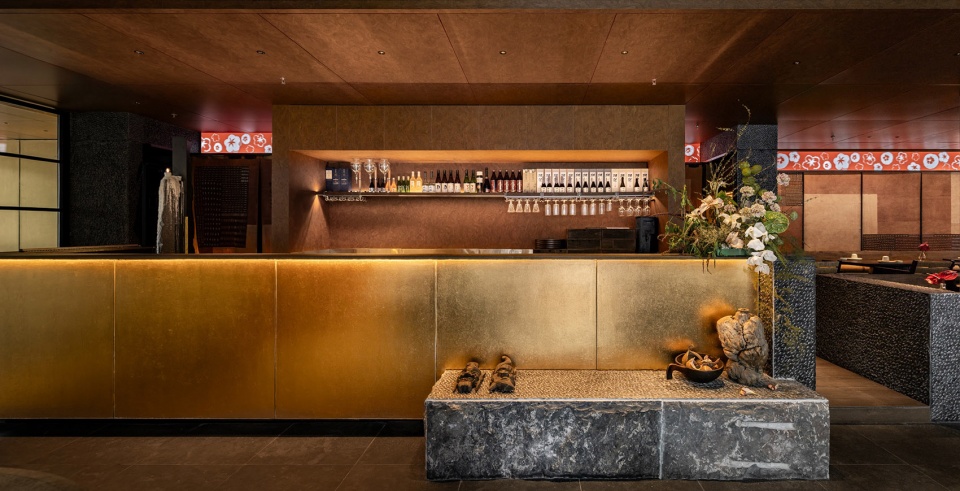 烛台黑色锋利,金箔在结构缝隙间闪烁。金箔的局部应用,不是浮夸,是平衡黑色石料的点睛。所有元素提炼后再恰当植入 是阴翳之美和当代活力的平衡与重构。