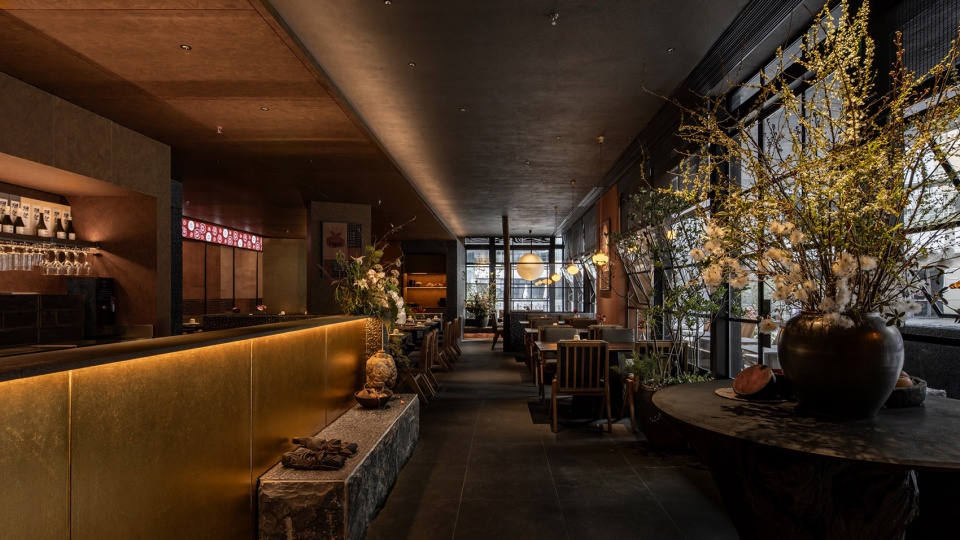 石料粗野自然。‘小满’黑色如水,表面似盈盈涌出的一汪水,粗粉野生石料亦被工匠驯服,是独一无二的自然力。金箔吧台与暖黄灯光、粗粝石材,木质桌椅共同营造出一个静谧而富有层次的场景。