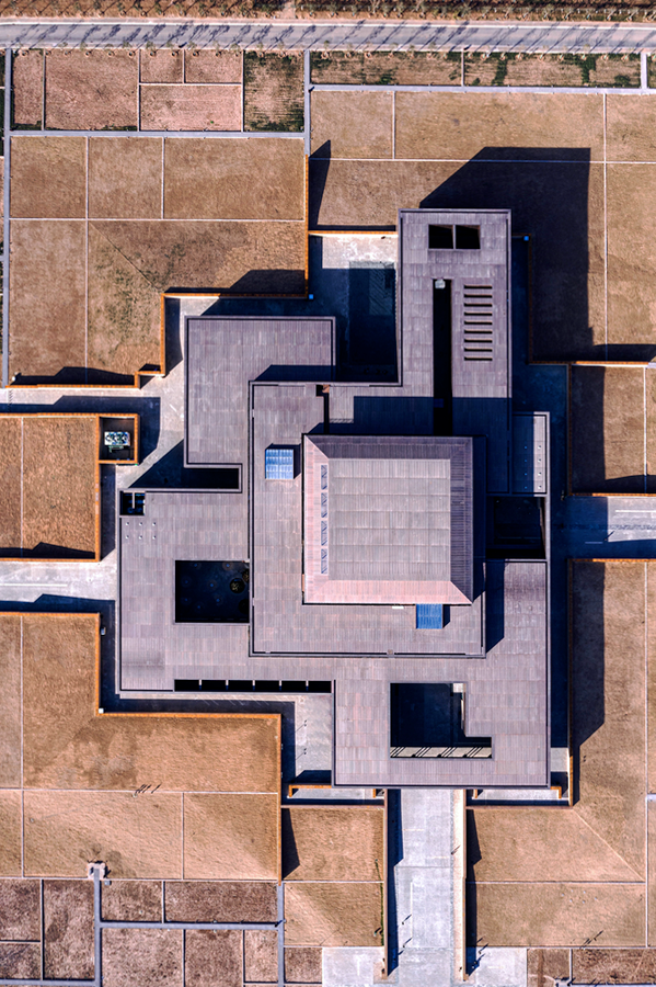 The architectural layout is coordinated with the overall style and features of the Erlitou site environment, and the body strategy of horizontal expansion is adopted. The low and stretched building volume extends horizontally and rises from the periphery to the center step by step, forming an 11~24m high and low architectural skyline, which echoes the characteristics of the platform where the Erlitou site is located. Enough farmland landscapes are retreated around the building to minimize the pressure of large-scale buildings on the environment and ensure the integrity of the original environment of the site.