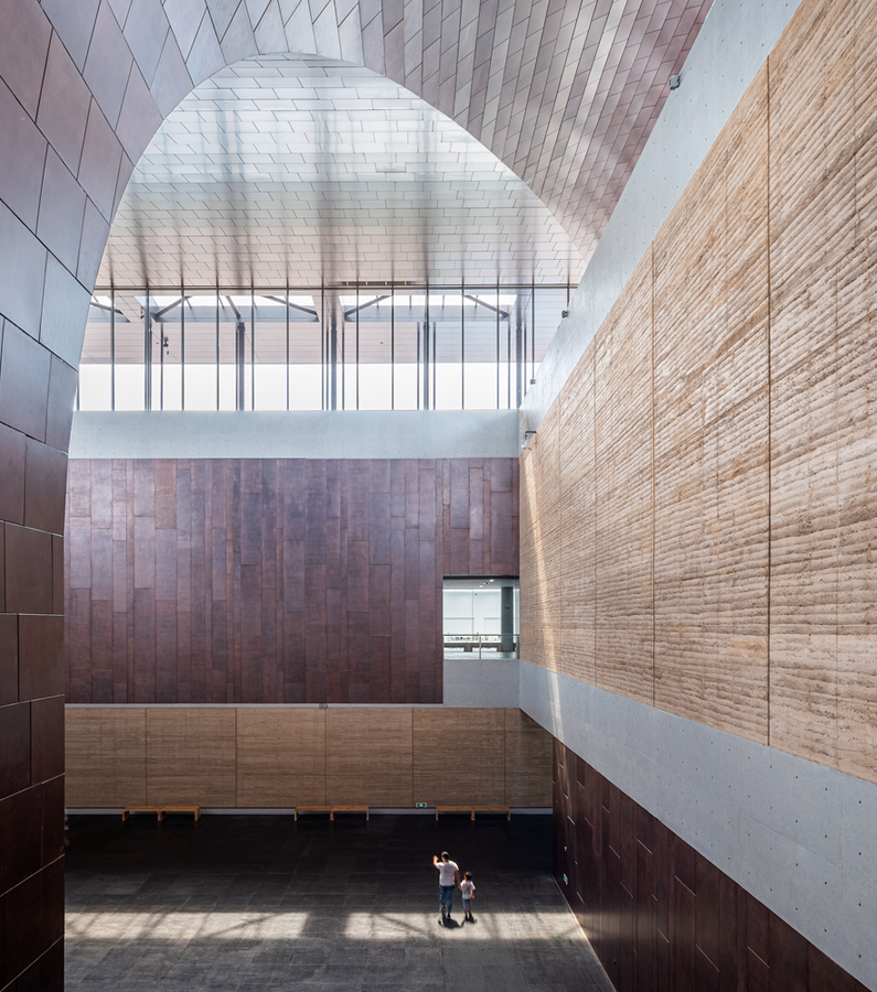 The part above the elevation of 4.5m of the outer wall of the museum is mainly made of red copper curtain wall. The dark copper plate has a sharp contrast with rammed earth, strengthening the floating sense of the upper horizontal volume, symbolizing the emergence of "the earliest China". Through the shape treatment of different heights, the main entrance courtyard with the characteristics of the Palace site, and the three column eaves Gallery of the roof sightseeing platform, a strongly implied Erlitou cultural intention has been formed. The exterior walls of buildings below the elevation of 4.5m and all landscape retaining walls are mainly made of hand rammed walls. The modern rammed earth construction technology presents a simple and delicate wall texture, which, as a material clue, naturally introduces the audience from the outdoors to the interior. The internal space surrounded by rammed earth enables the audience to experience the feeling of the site space everywhere.