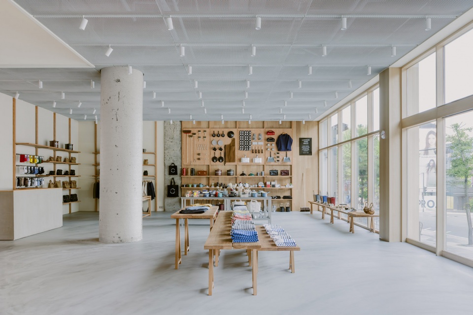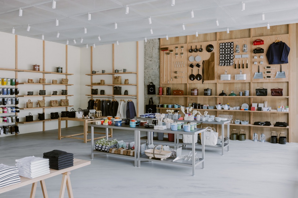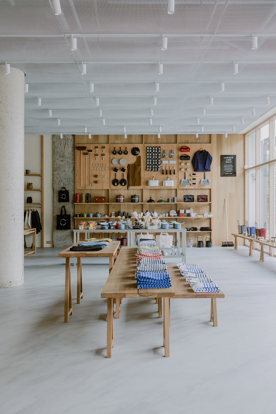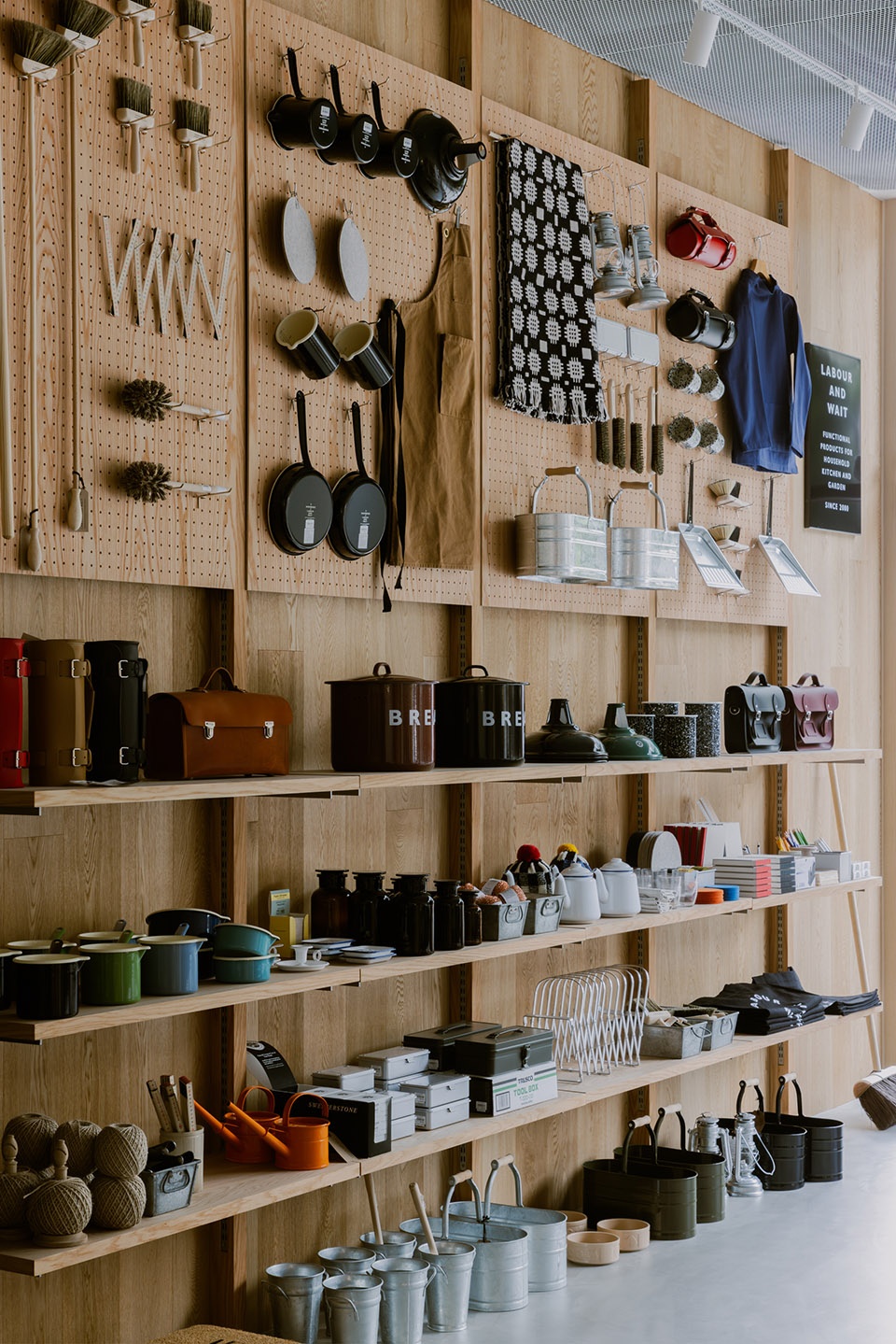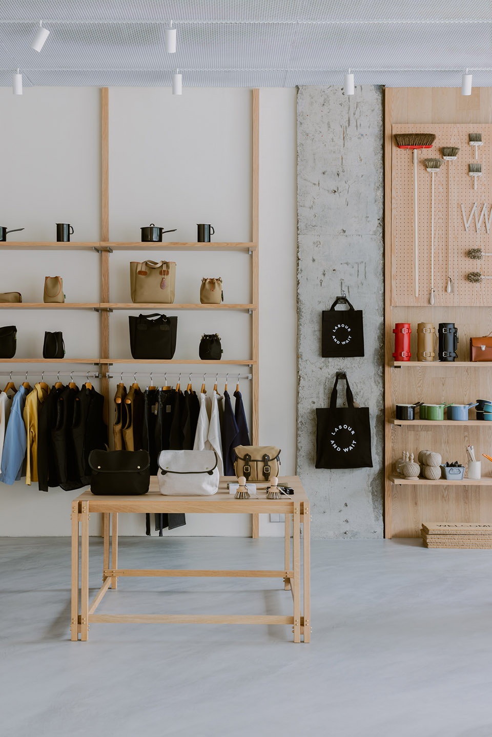 Given the variety of goods in the LABOUR AND WAIT section, we incorporated wooden pegboards as a flexible display surface that supports evolving merchandising needs. At the center, we repurposed stainless-steel counters—common in home kitchens—as display tables to evoke a sense of everyday familiarity.
