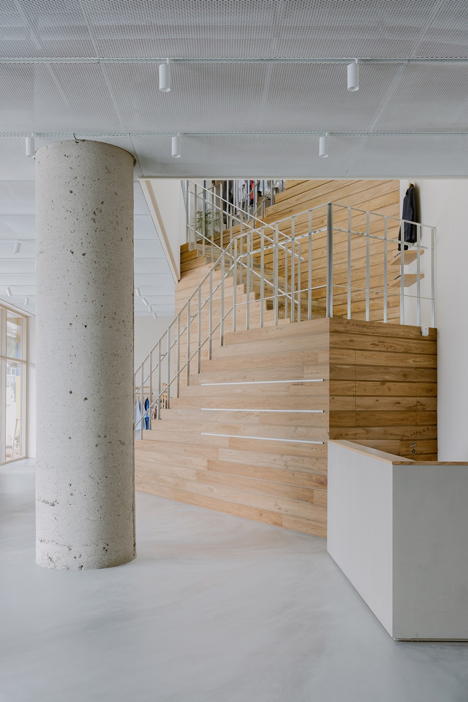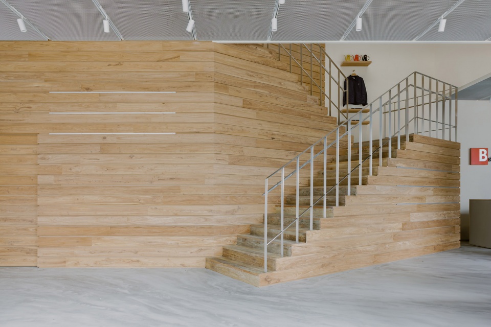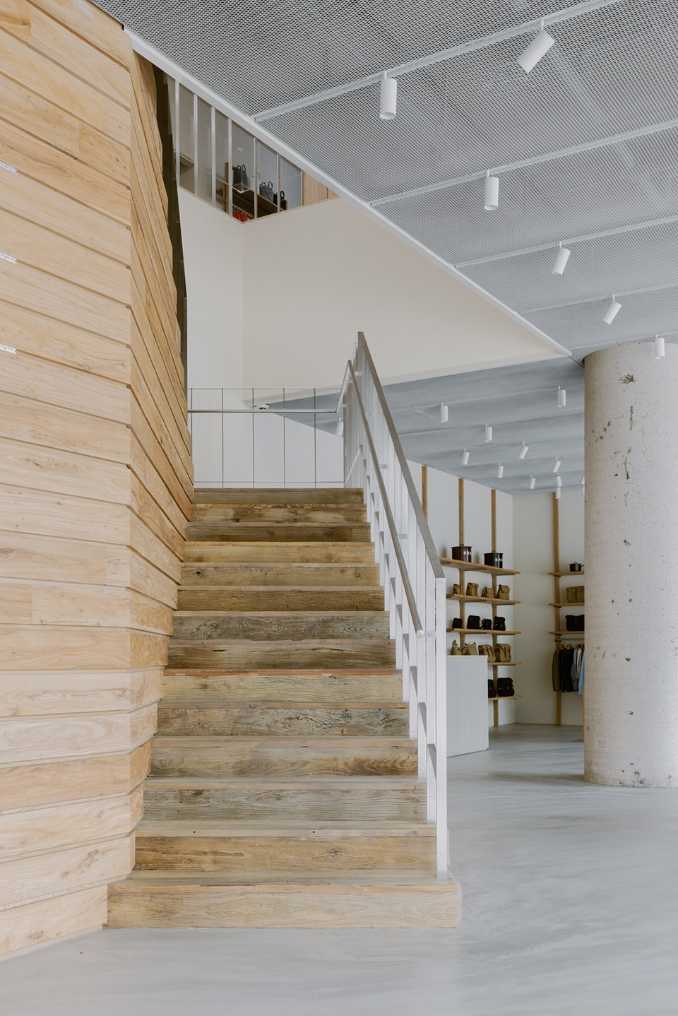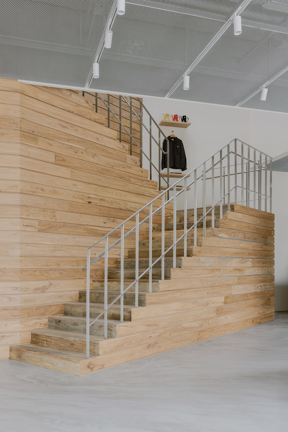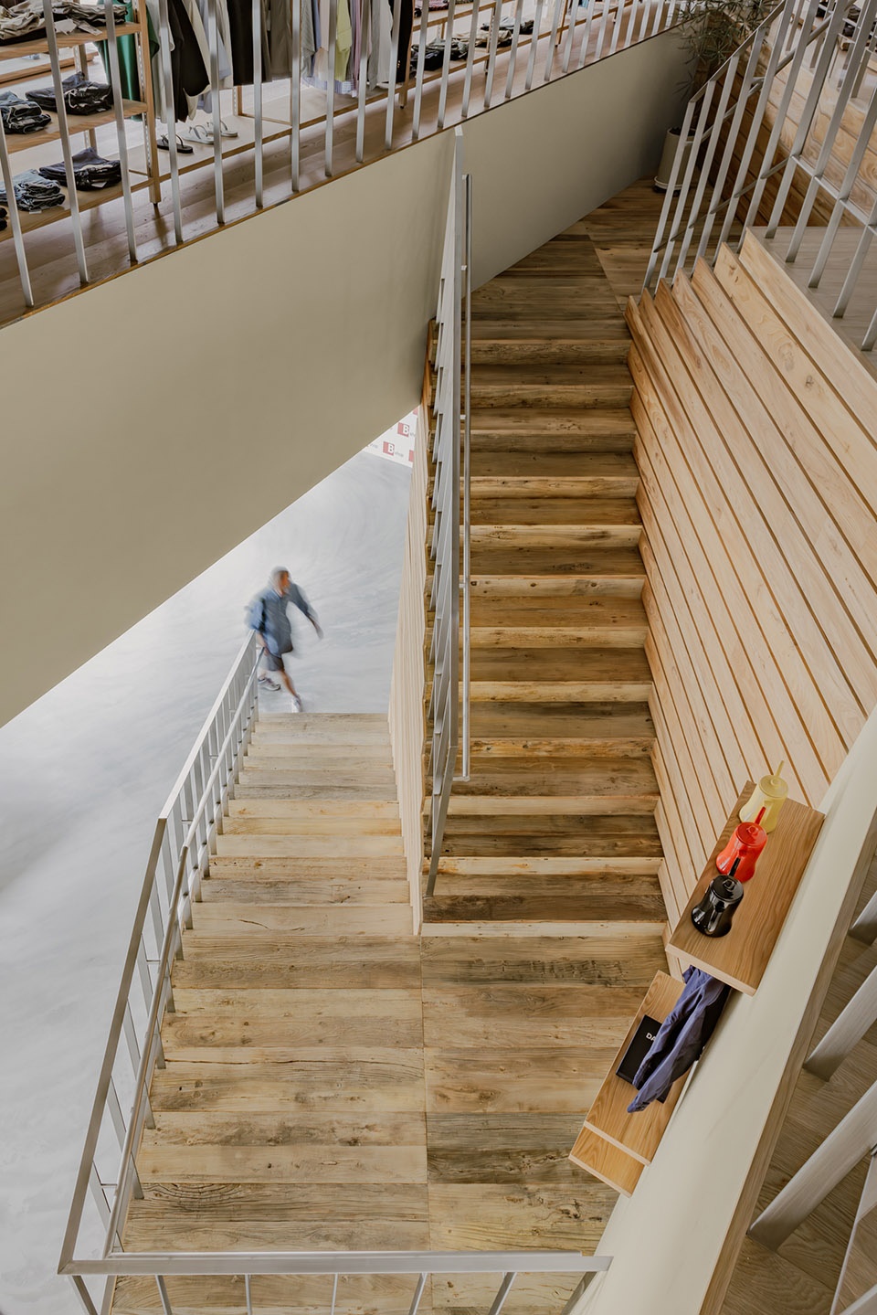 As a spatial anchor on the first floor, we designed a prominent wooden staircase that combines fitting rooms, storage, and product display within a single integrated structure. Constructed from reclaimed wood, the staircase bears visible traces of past use, lending the space a quiet warmth and a sense of material memory.
