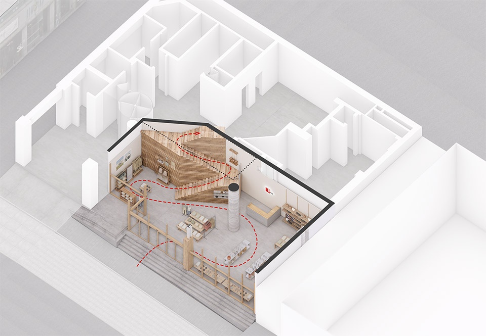 我们以原有墙面为基准,平行增设一道楼梯。入口处的客人将自然被楼梯吸引,并沿其步上行进——楼梯两侧的陈列设计将引导视线与动线,逐步探索至二层空间。